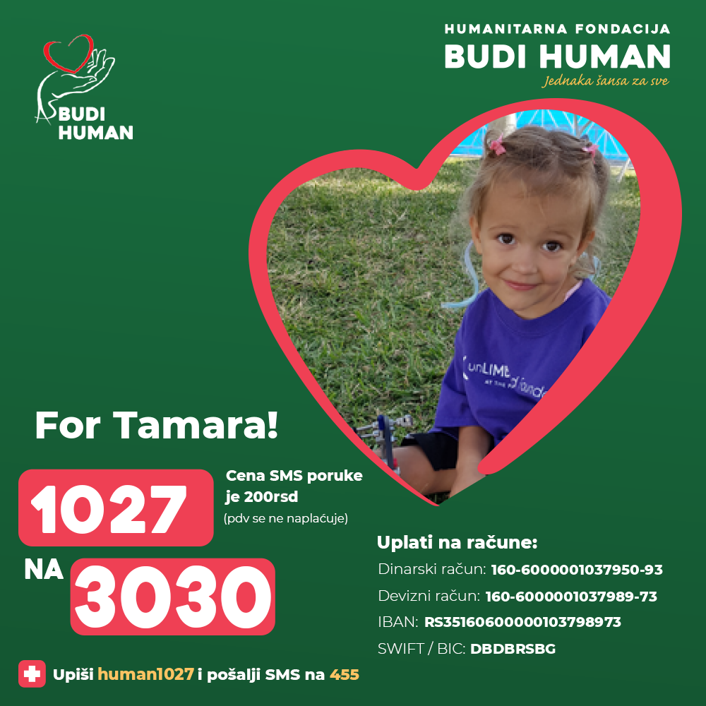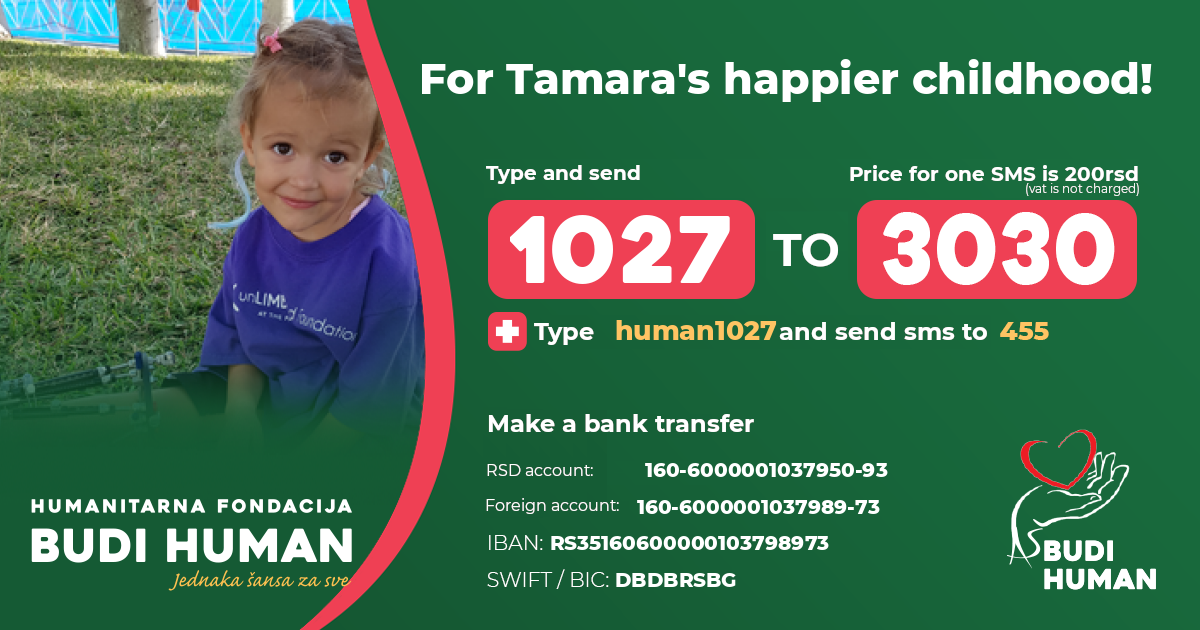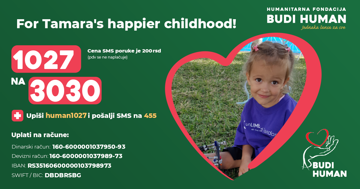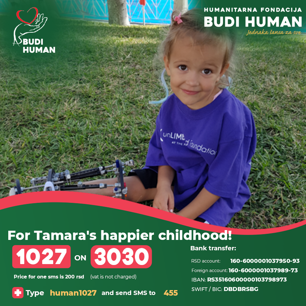 Tamara was born in 2016 in Belgrade. She was born with a deformity of the right leg and foot, which caused a difference in the length of her legs, more than 10 cm. Immediately after birth, she was diagnosed with Dg. Q68.4 Curvatura tibiae et fibulae congenita (congenital deformity of lower leg, curvature of tibia and fibula).