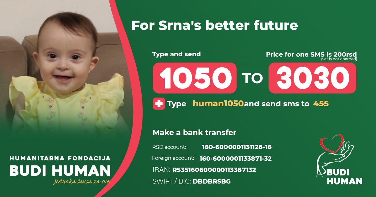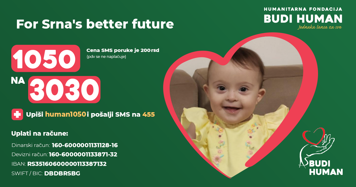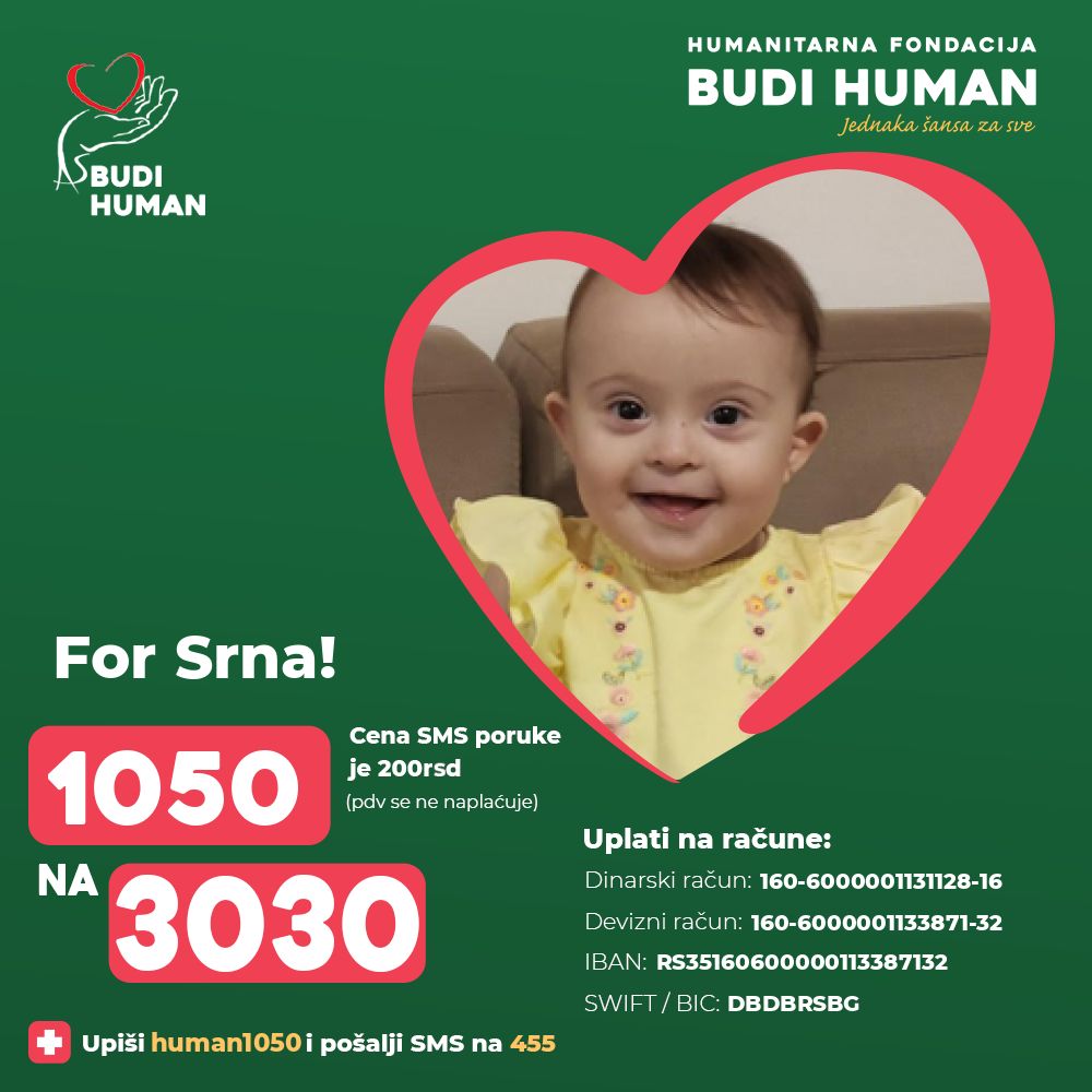 Srna is a baby who does not take a smile off her face. Her smile gives her parents the strength to persevere in the fight to help her and make her childhood easier. Her parents are not able to pay the costs of treatment themselves, so they ask all humane and generous people to help them, so that Srna can go abroad for treatment as soon as possible.