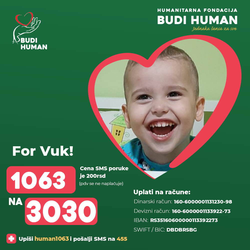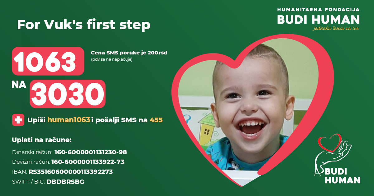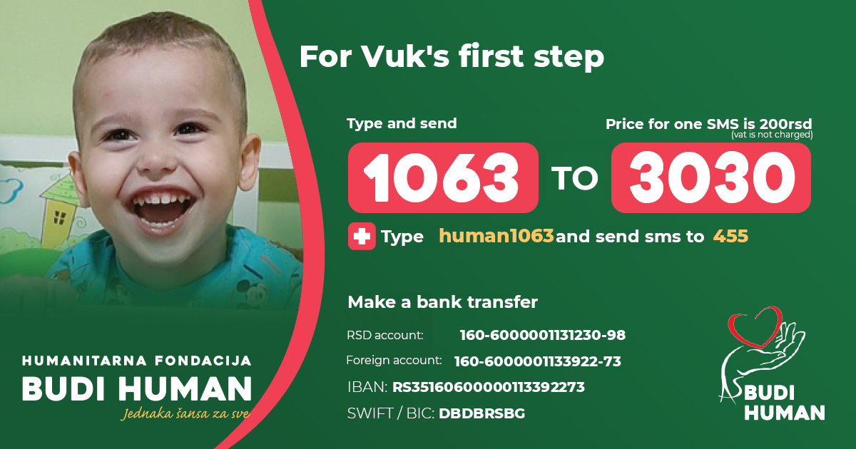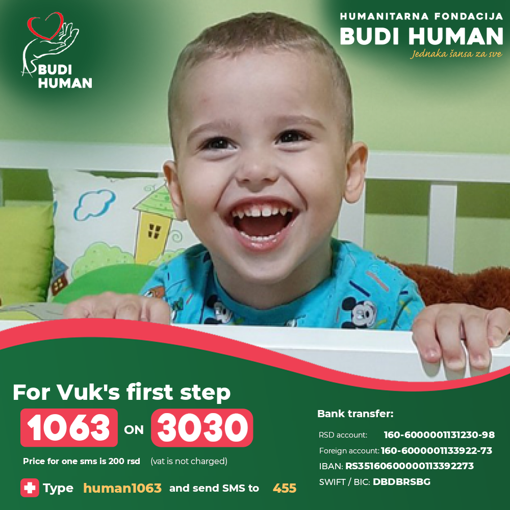 So far, his parents have financed the treatment, but they have exhausted all resources, so they ask all humane and generous people to help them persevere in this fight, so that Vuk can make his first step and run with his twin brother.