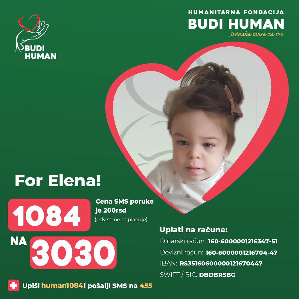 Elena was born on 20 February 2019 in Belgrade. She was the child born after a properly monitored high-risk pregnancy. At birth, she was graded (9) due to Pes equinovarus (foot deformity) which was treated and corrected with casts and physical therapies.