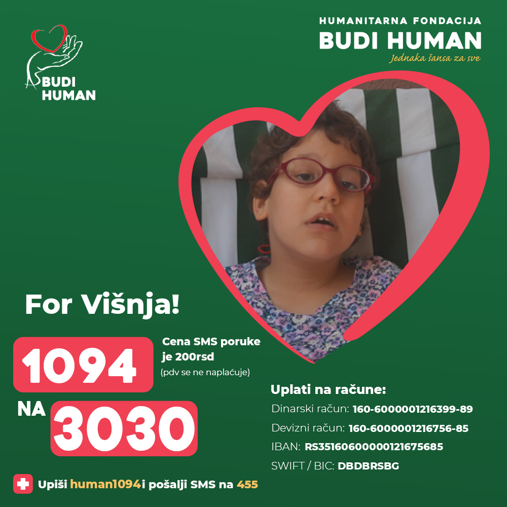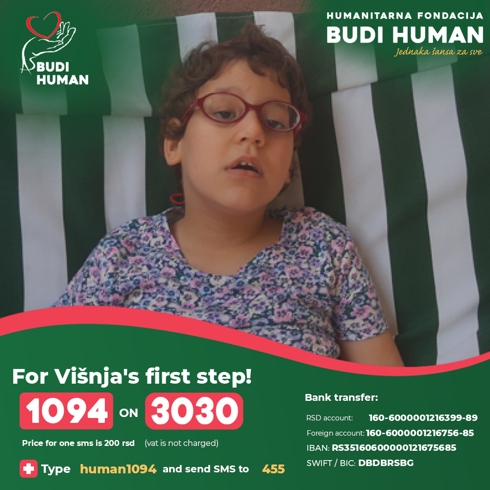 In order to progress in the treatment and stand on her own feet, intensive work is needed. Višnja's parents have financed all the treatment so far and exhausted all resources, so they ask all humane people to help them with their donations.