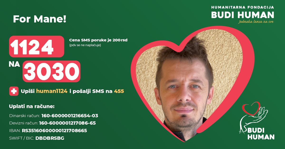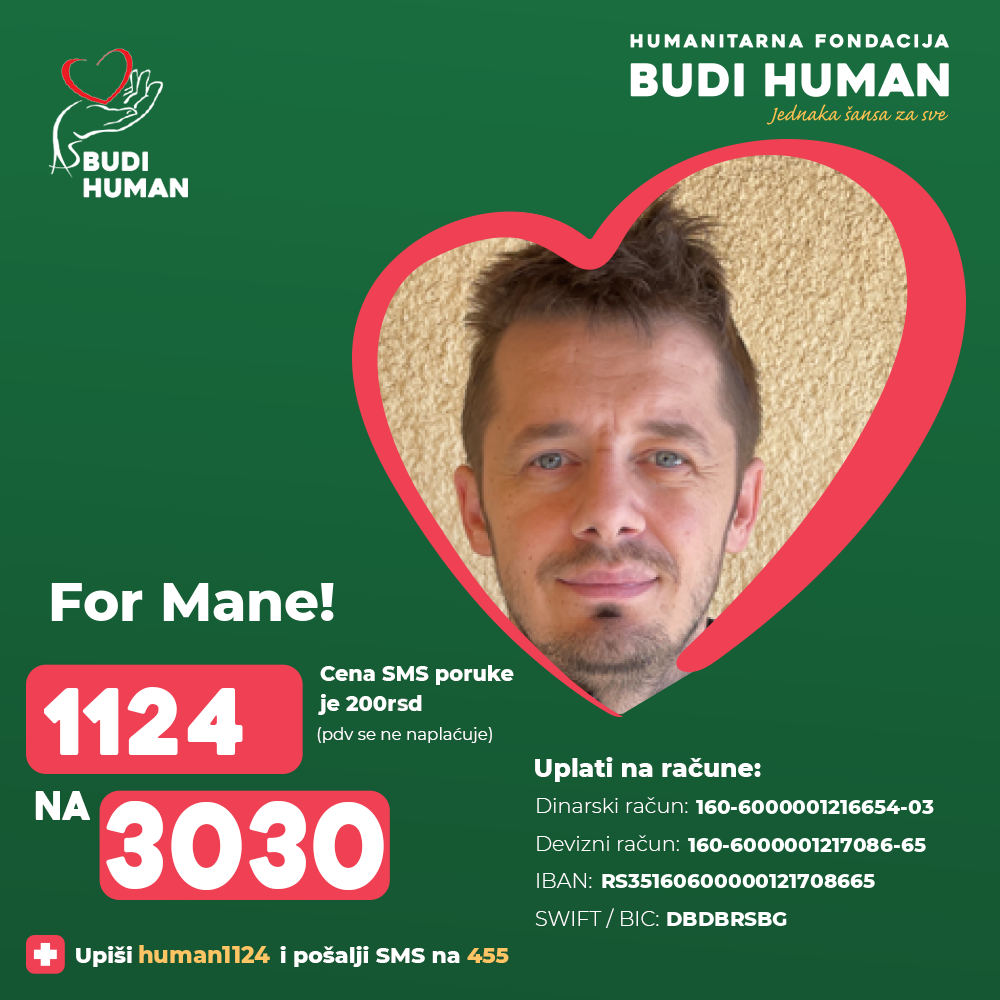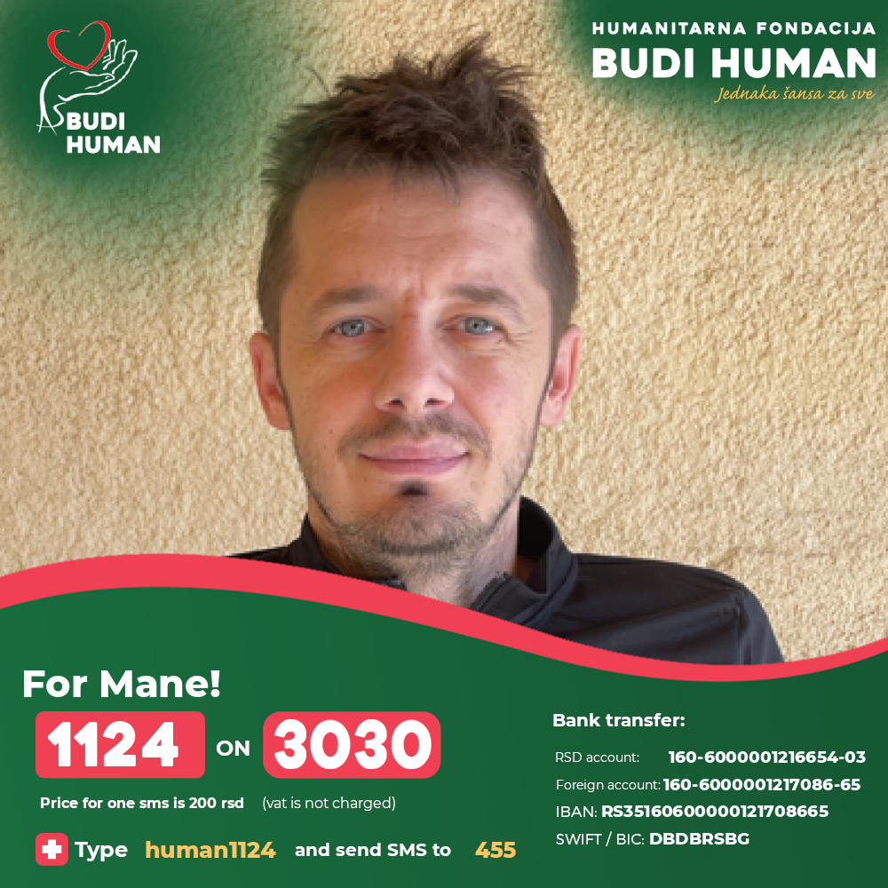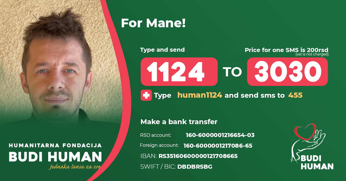 Mane's lower extremities were paralysed and he was diagnosed with paraplegia. After 2 months of treatment and a fight for life in the Emergency Center, rehabilitation followed in the institution "Dr Miroslav Zotović" in Sokobanjska in Belgrade, which is still in progress.