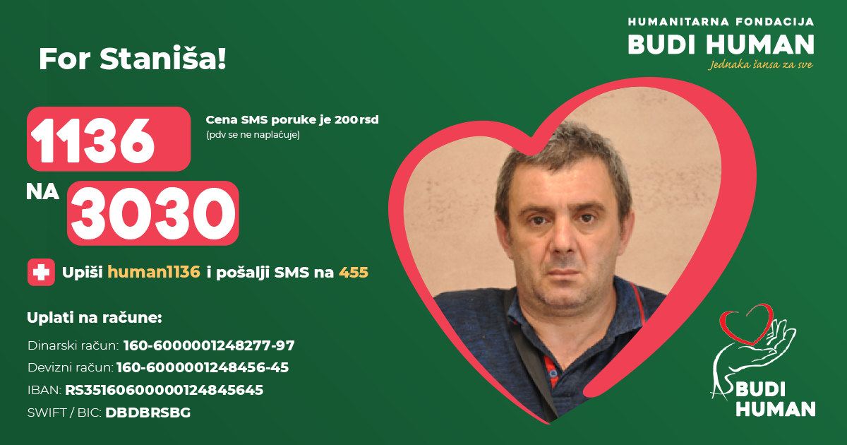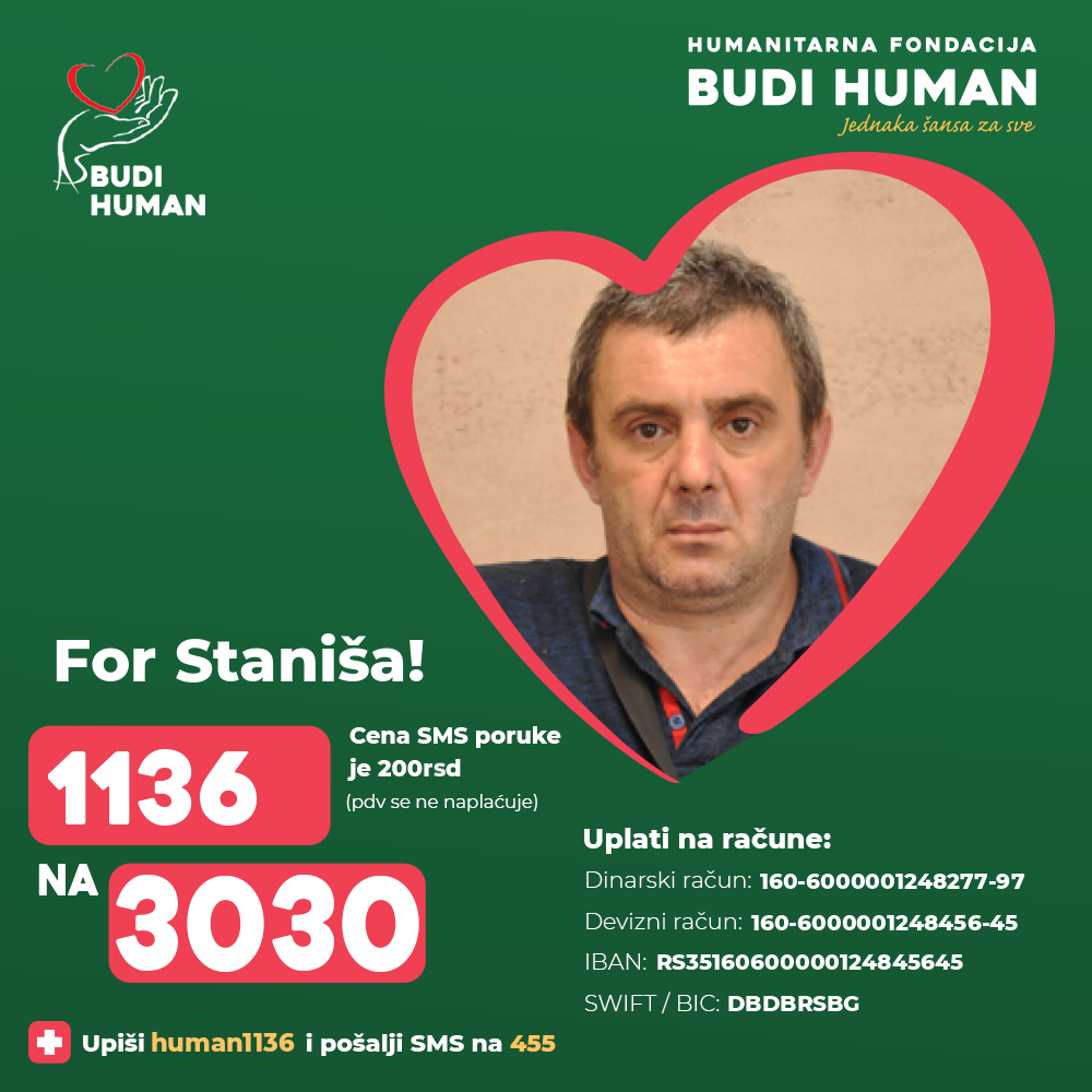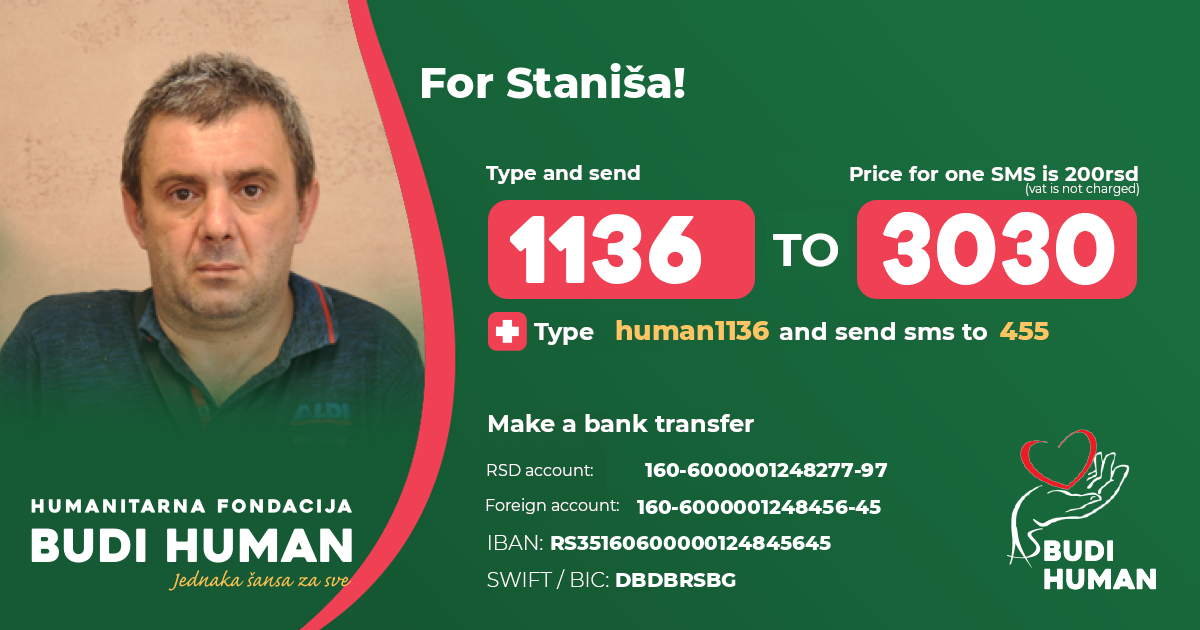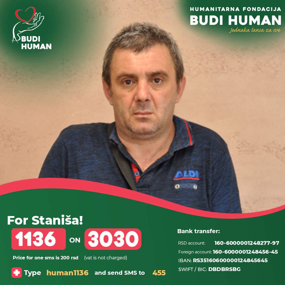 Staniša has not been working for a year, he has two minor children and he is not able to finance the operation, so he is asking all humane people to help him.