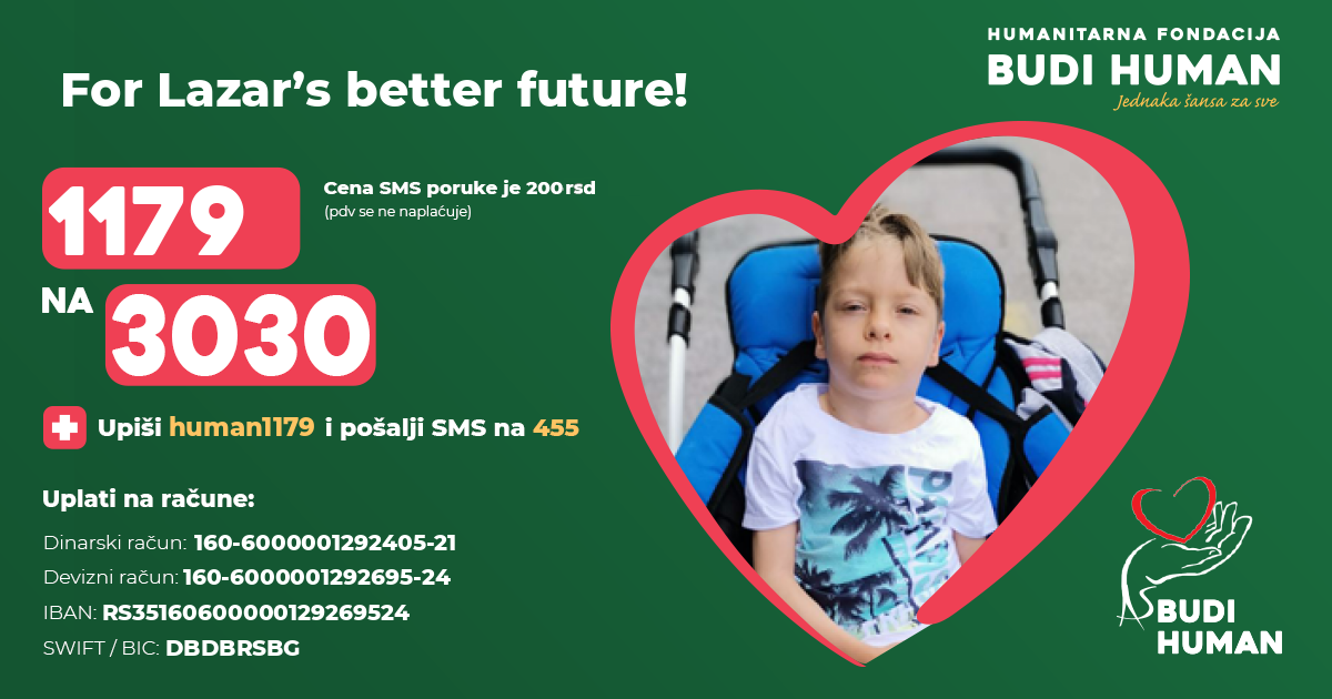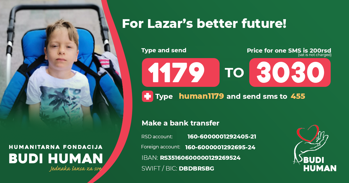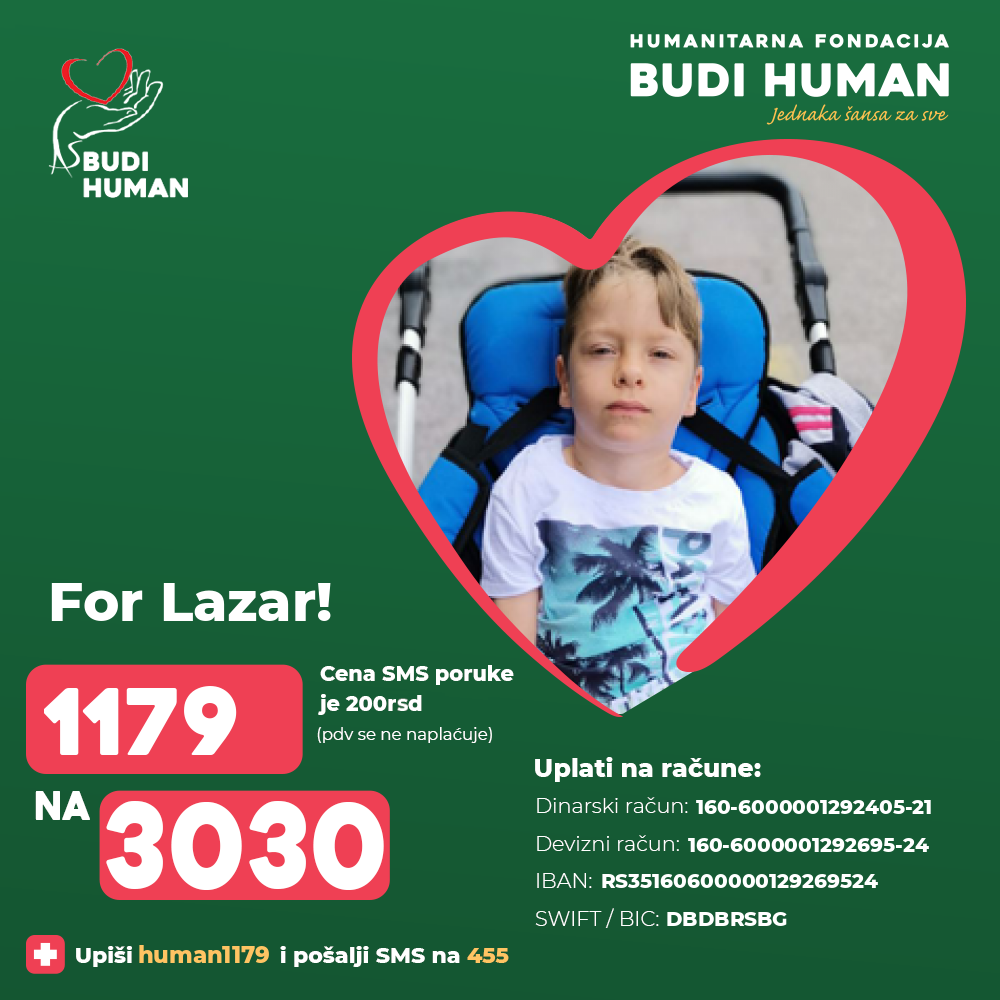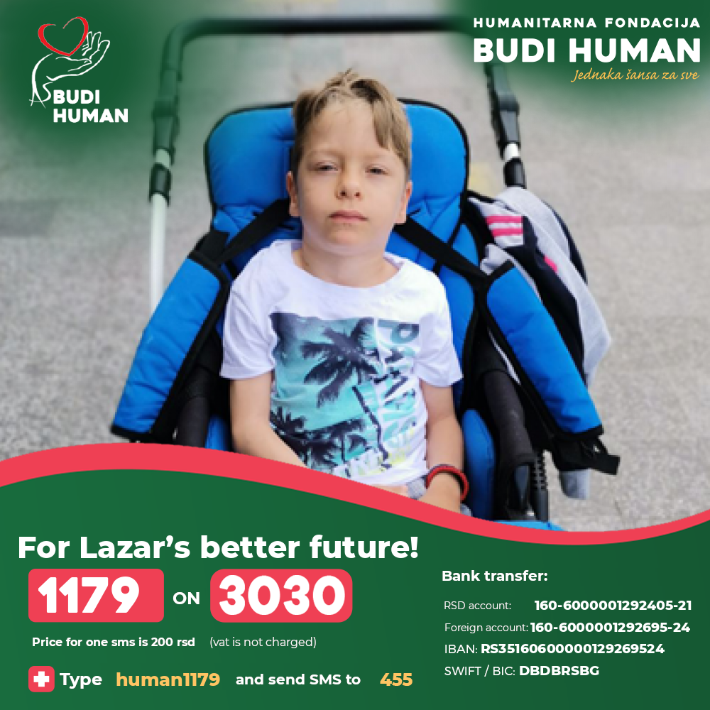 Lazar was born on 1 June 2015 in Belgrade after a properly maintained and controlled pregnancy. Due to complications at birth, Lazar experienced great trauma, which caused great health damage, cerebral palsy, epilepsy, cardiomyopathy, hypoglycemia and delayed psychomotor development.