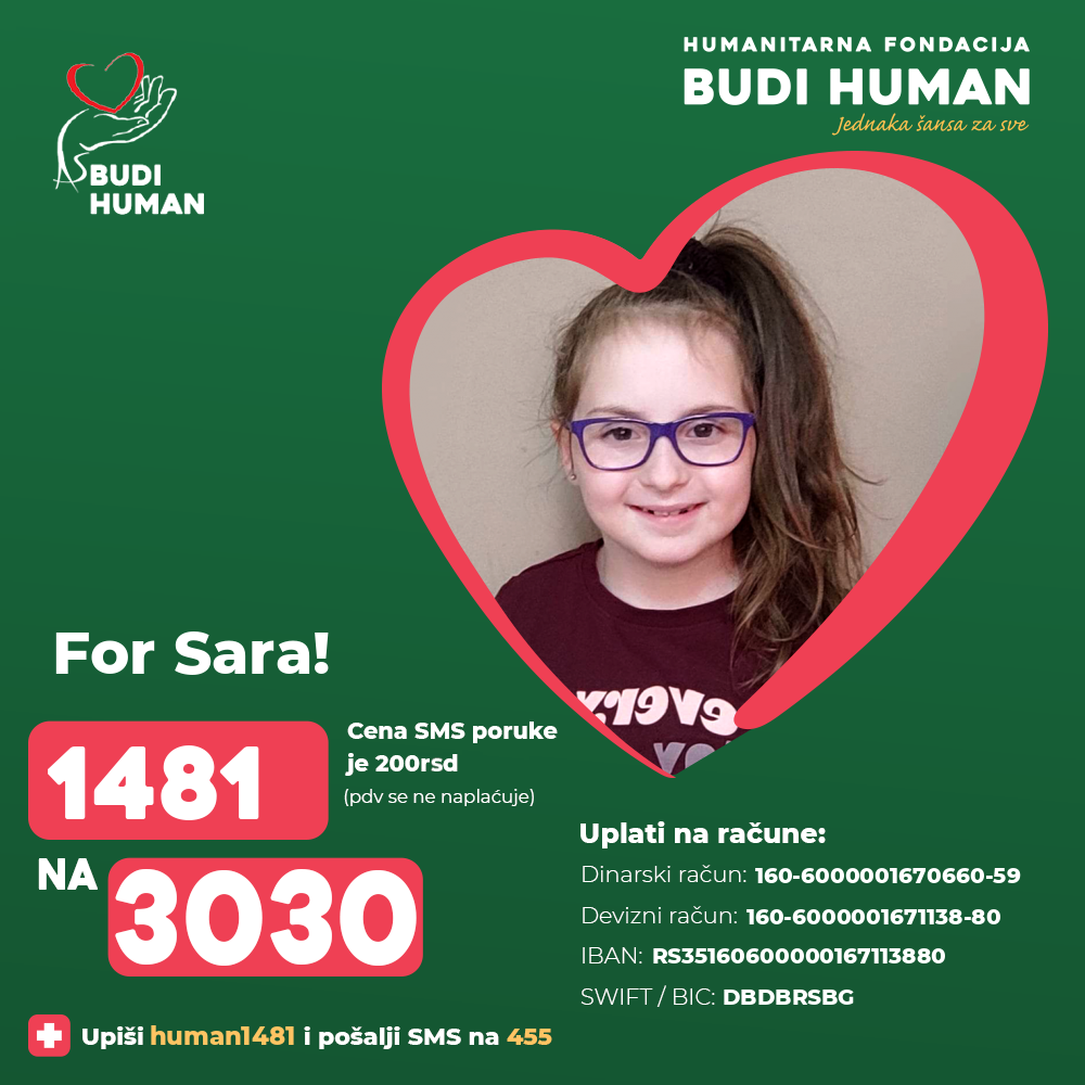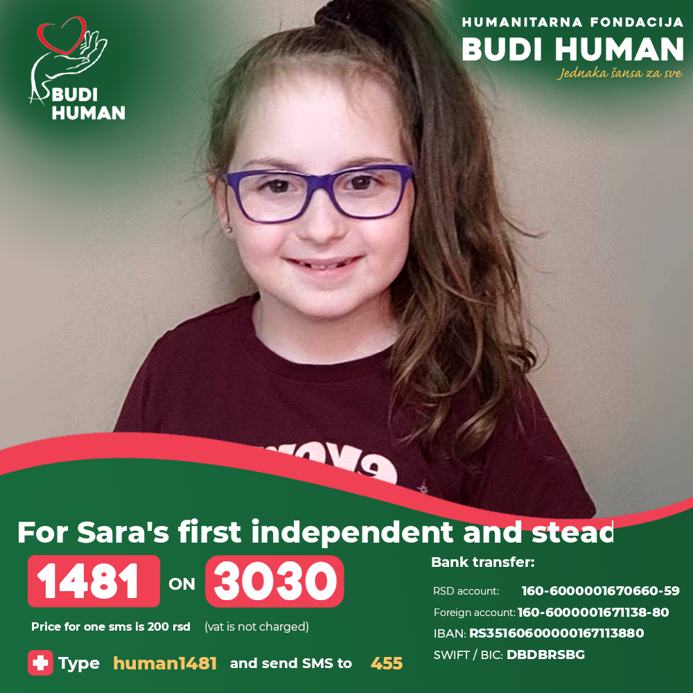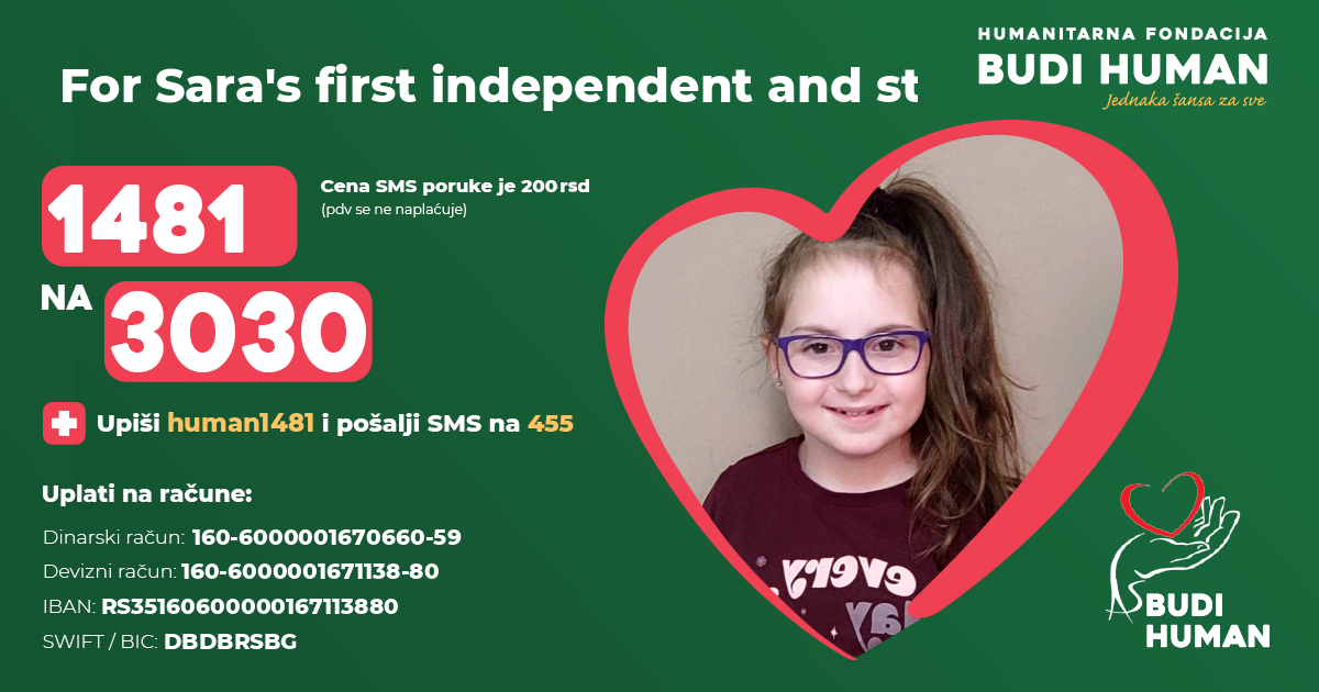 In order to make her first independent and steady step, she needs funds for robotic neurorehabilitation. For that reason her parents are asking all generous people to help with their donations so that Sara can continue her rehabilitation as soon as possible.