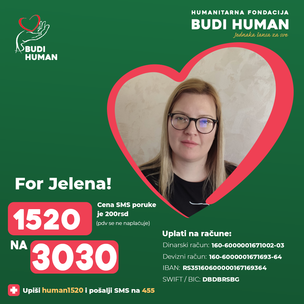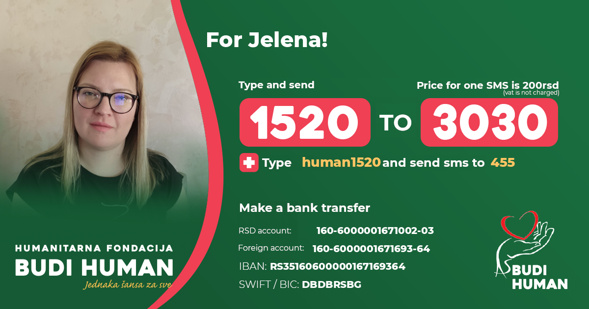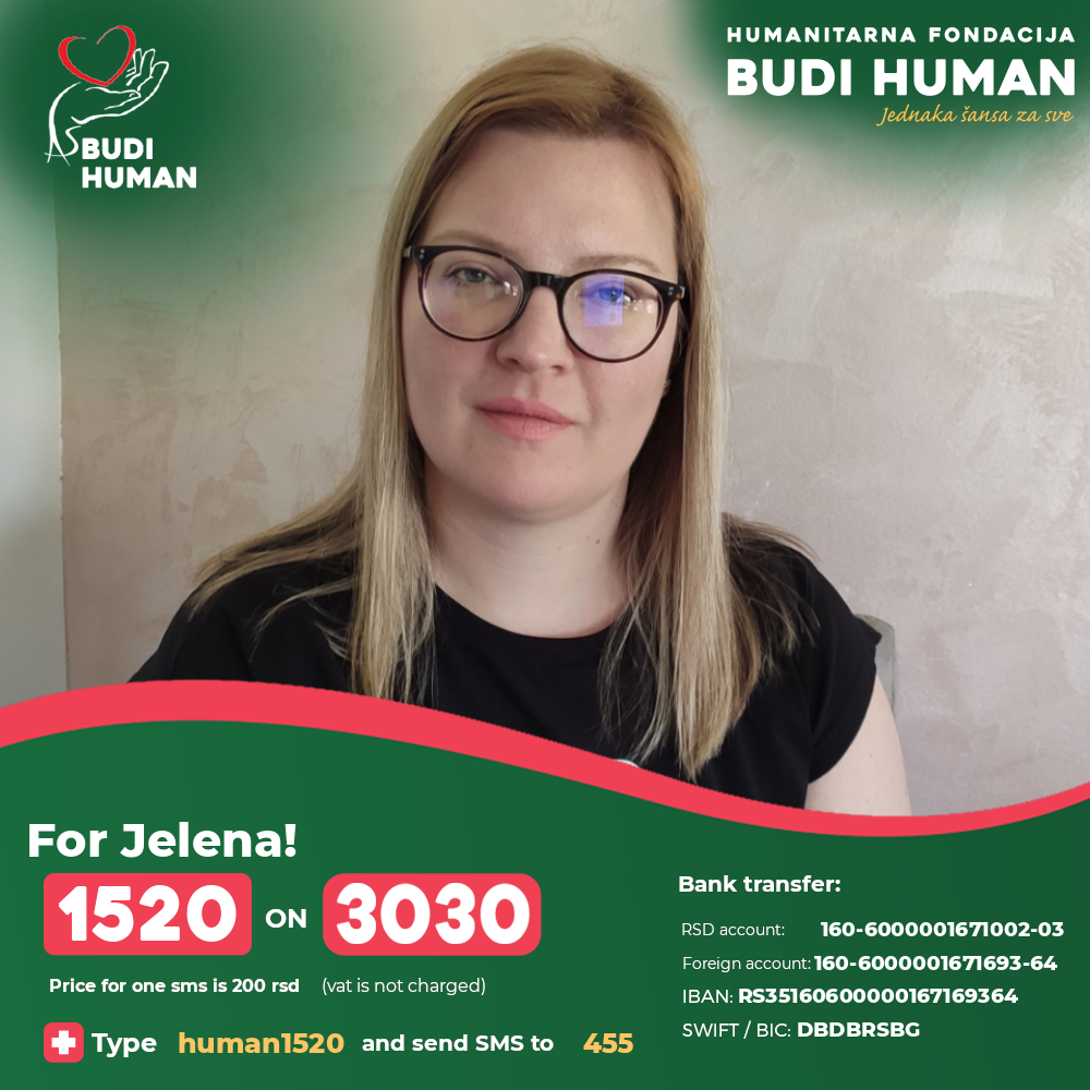 In hope to find the way for stopping the progression of the disease Jelena contacted the Pirogov National Medical and Surgical Center in Moscow, from which she received a positive response that they were ready to help her with HSCT therapy, the application of which has shown great success in patients with this disease. This therapy costs are very high and Jelena is asking all generous people to help her with their donations so that she can continue the treatment as soon as possible.
