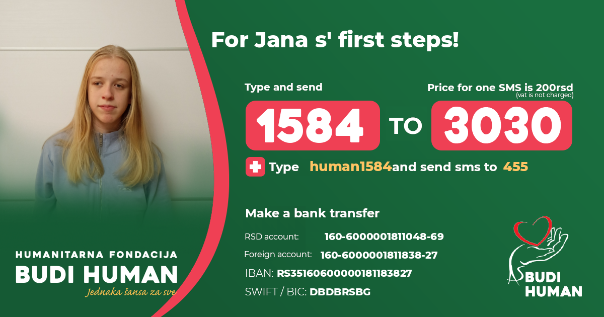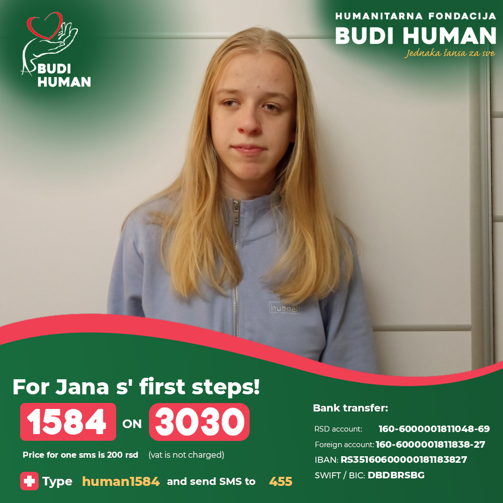 Jana was born after the second, maintained pregnancy, which ended in 29th gestation week. At birth, primitive reflexes were incomplete, and due to immaturity and the development of RD SY (respiratory distress syndrome), Jana was transported to the Institute of Neonatology. Since the third month, she has been treated at the Special Hospital for Cerebral Palsy and Developmental Neurology. Muscle tone is discretely increased in the right extremities and more emphasised in the arm. Head control is not developed according to her age. She has high level deformity of the feet. She was diagnosed with cerebral palsy (G80.1 Paralysis Cerebralis spastica diaplegica) as well as with mixed specific developmental disorders (F83 Disordines evolutionis specifici mixti).