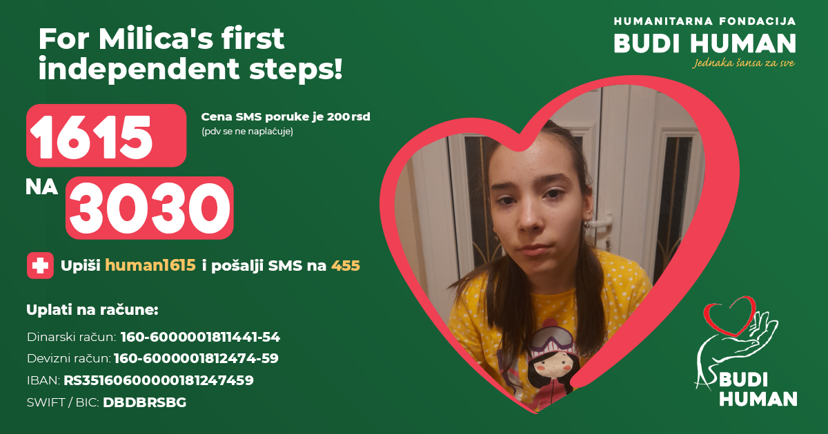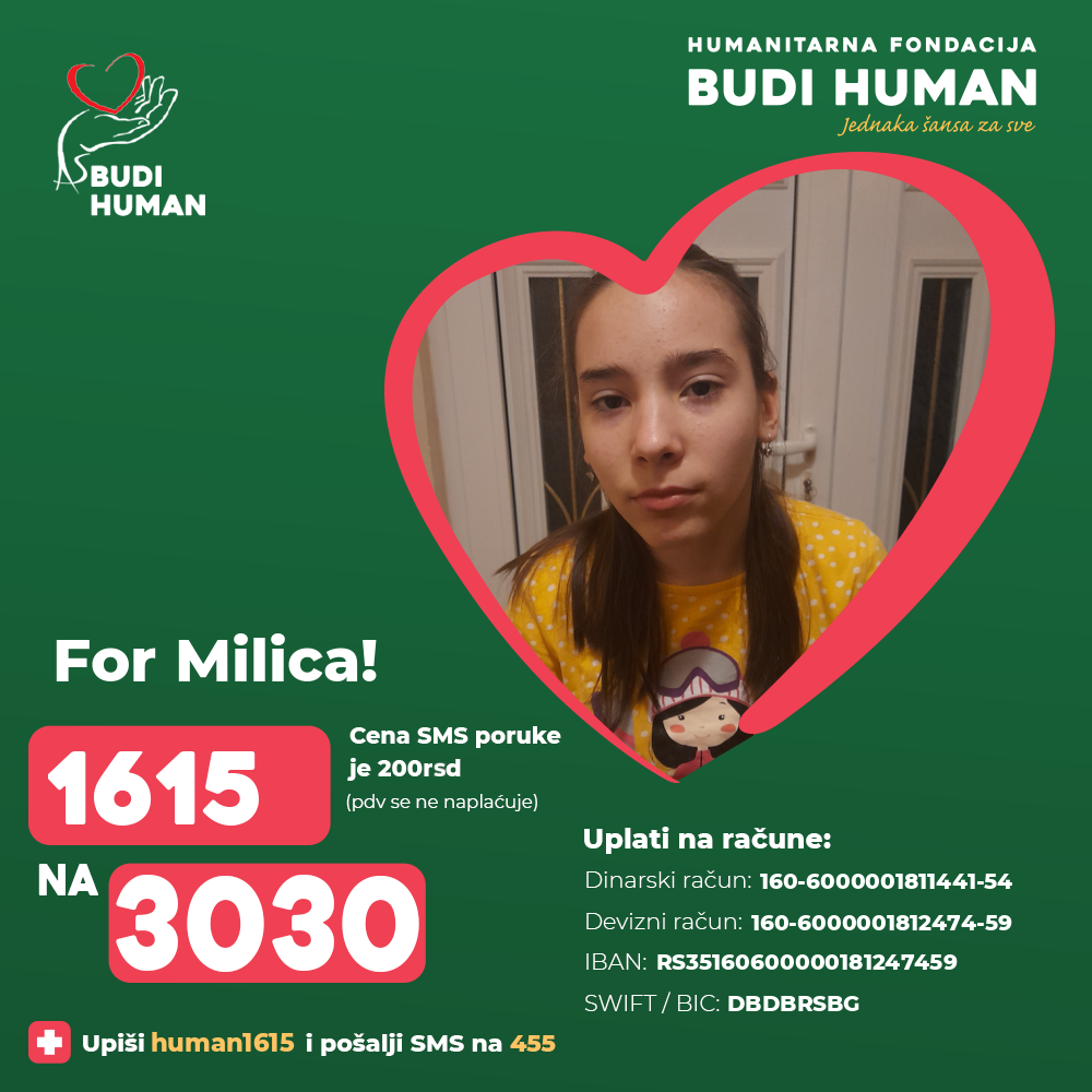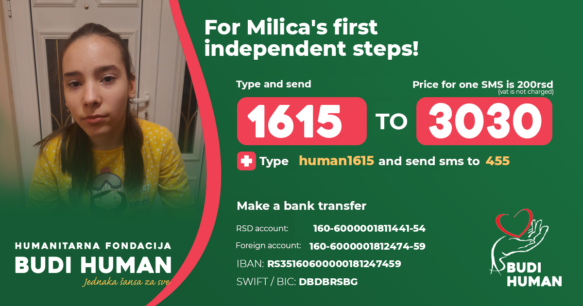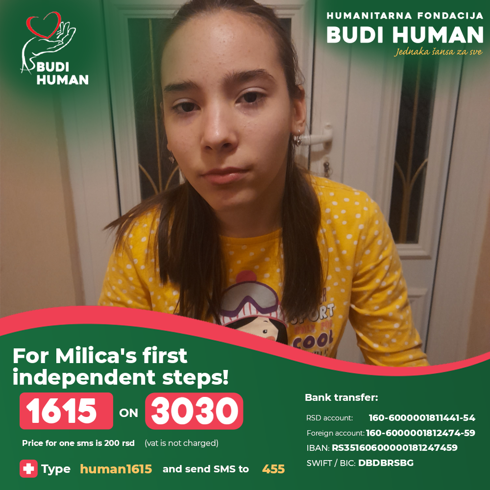 In order  to be able to move independently, it is necessary to perform another surgical intervention demanding considerable costs, which is why her family appeals to all humane people to help with their donations so that the necessary funds can be collected as soon as possible and Milica can take her first independent steps.