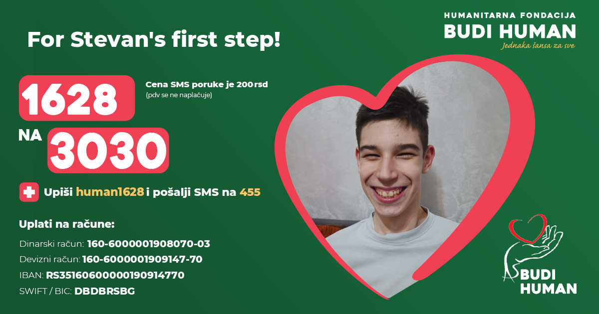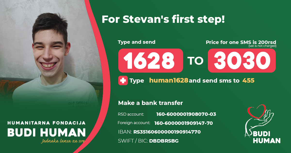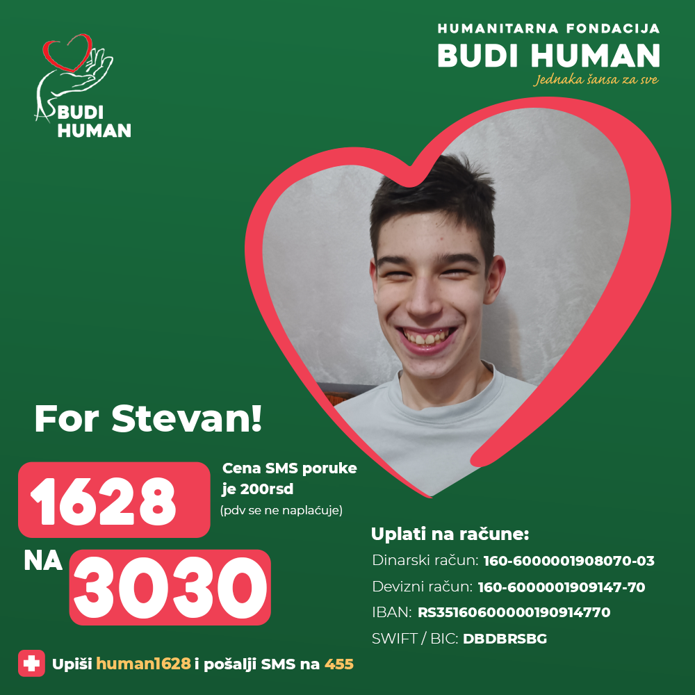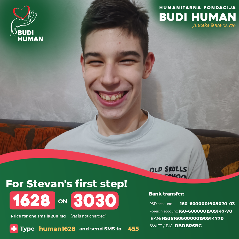 Stevan delays in psychomotor development from the beginning. He does not crawl, maintains a sitting position only with support, and does not walk. He started speaking at the age of two. He underwent habilitation treatments on several occasions.