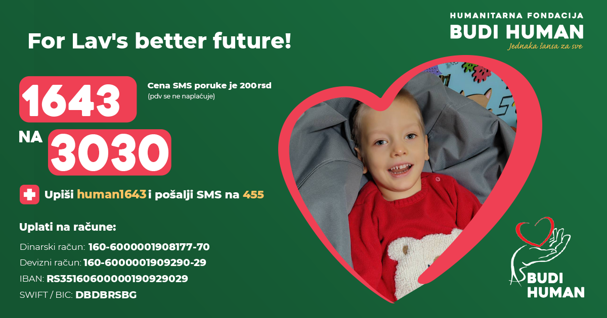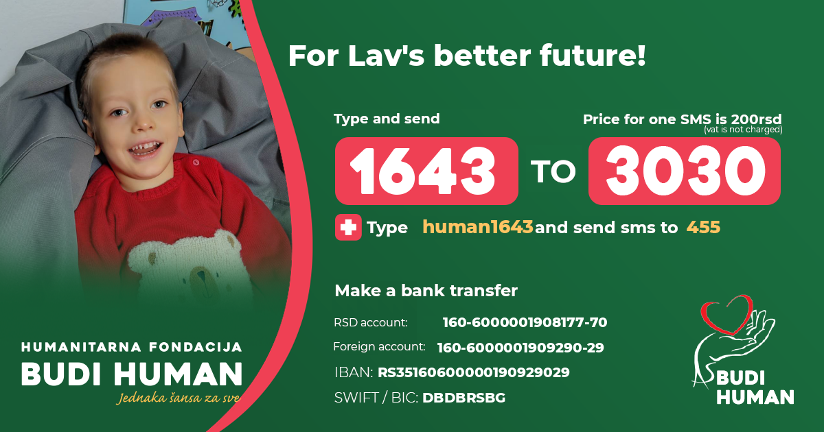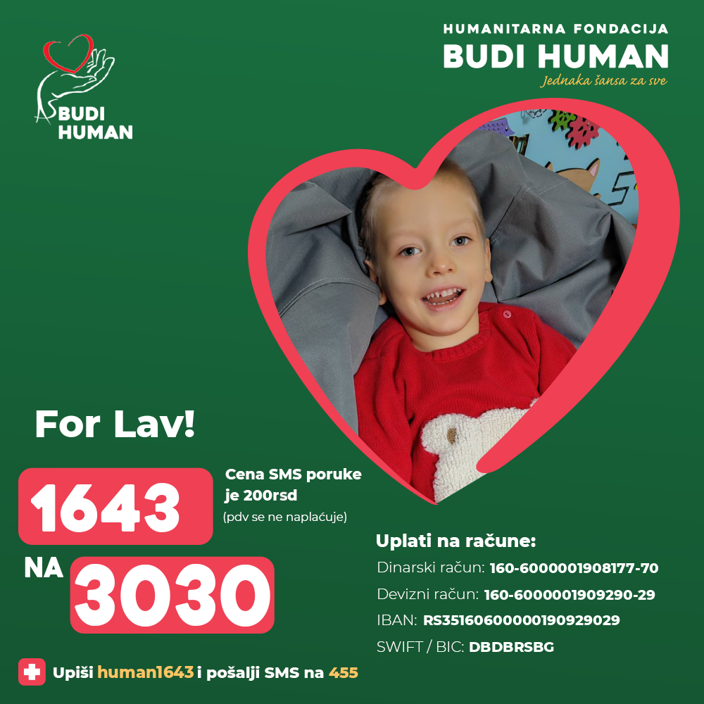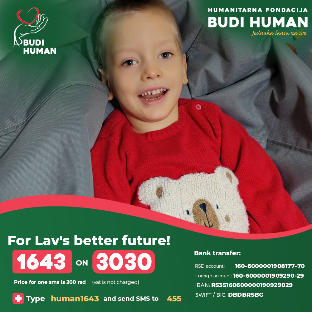 Lav still does not have full head control, does not sit, crawl, stand up, does not speak, and does not have the ability to eat solid food. With continuous therapy, there is progress, but not enough. Until now, his parents have financed the costs of treatment and exhausted all funds, so they are appealing to all generous people to help with their donations.