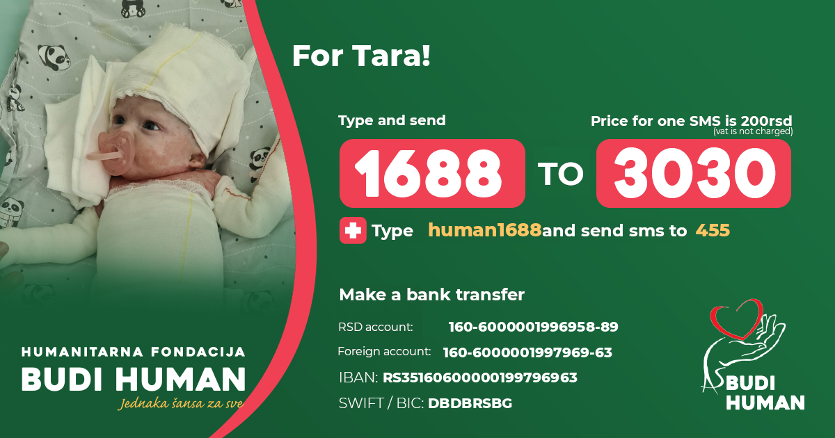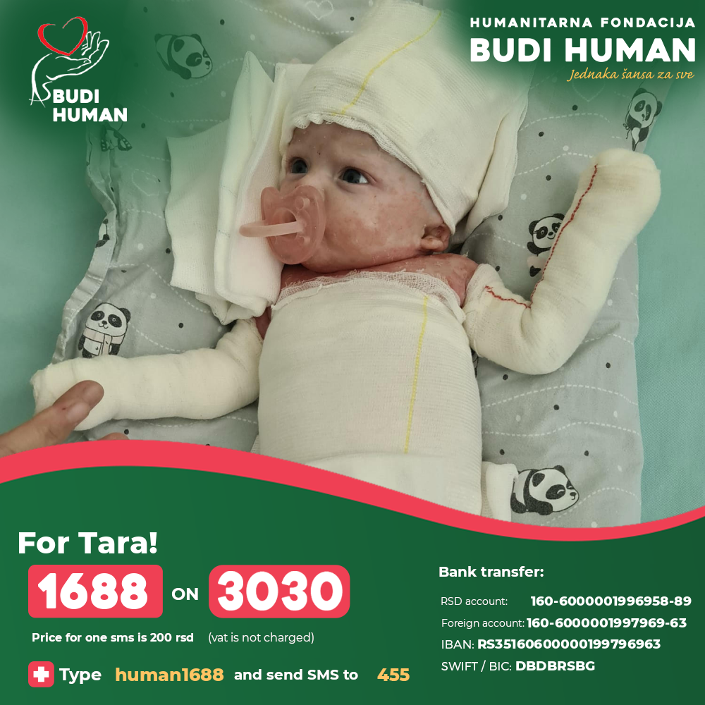 Given that treatment costs are very expensive and that treatment requires very specific and serious care (special bandages, plasters, medical creams and ointments, medicines, clothing, nutrition and supplementation) all in order to prevent further complications caused by infections, it is necessary for her to have specialist medical examinations, rehabilitation, physical and other therapies. Tara's parents need help because prevention and quality care are necessary parameters to prevent the disease from progressing and for Tara to have as bright a future as possible.