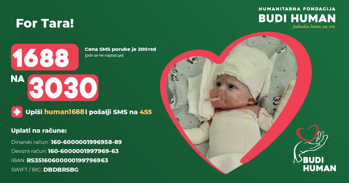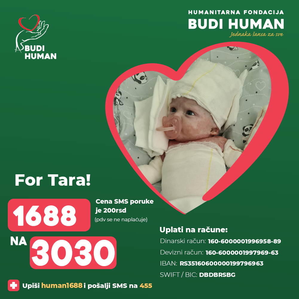 Tara was born in April 2024, after the second, regular and controlled pregnancy. Immediately after birth, it was observed a complete lack of skin on the lower legs and feet , as well as extensive erosions in the area of the glutes, thighs and forearms, bullous changes in the oral cavity on the gums, tongue, back wall of the pharynx. Two hours after birth, in a very serious general condition, she was transported to Institute for Healthcare of Children and Youth of Vojvodina, where a genetic analysis determined that Tara suffers from a serious and rare genetic disease called epidermolysis bullosa, known to the public as the disease of "butterfly children".