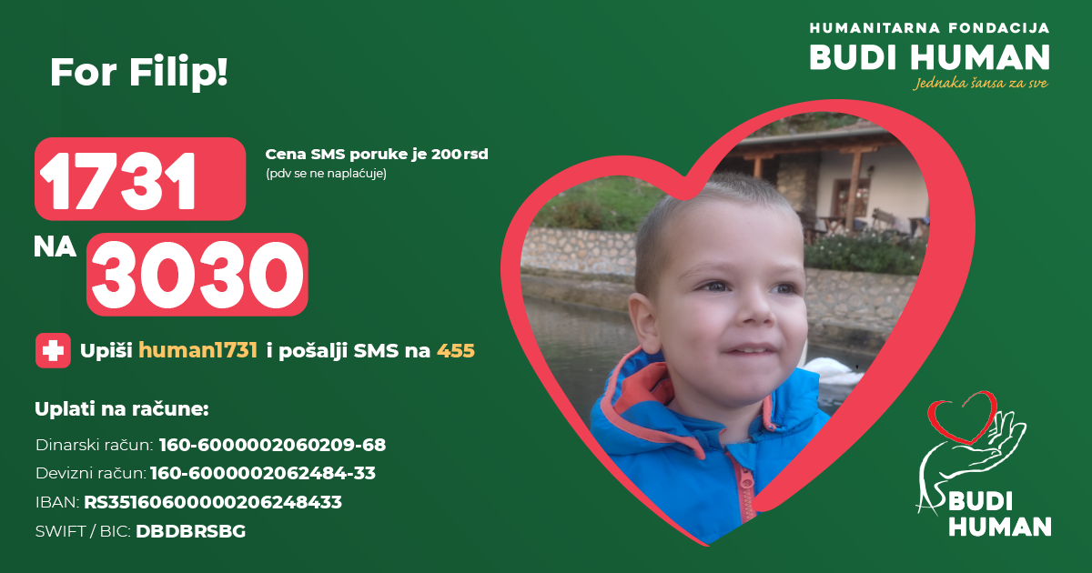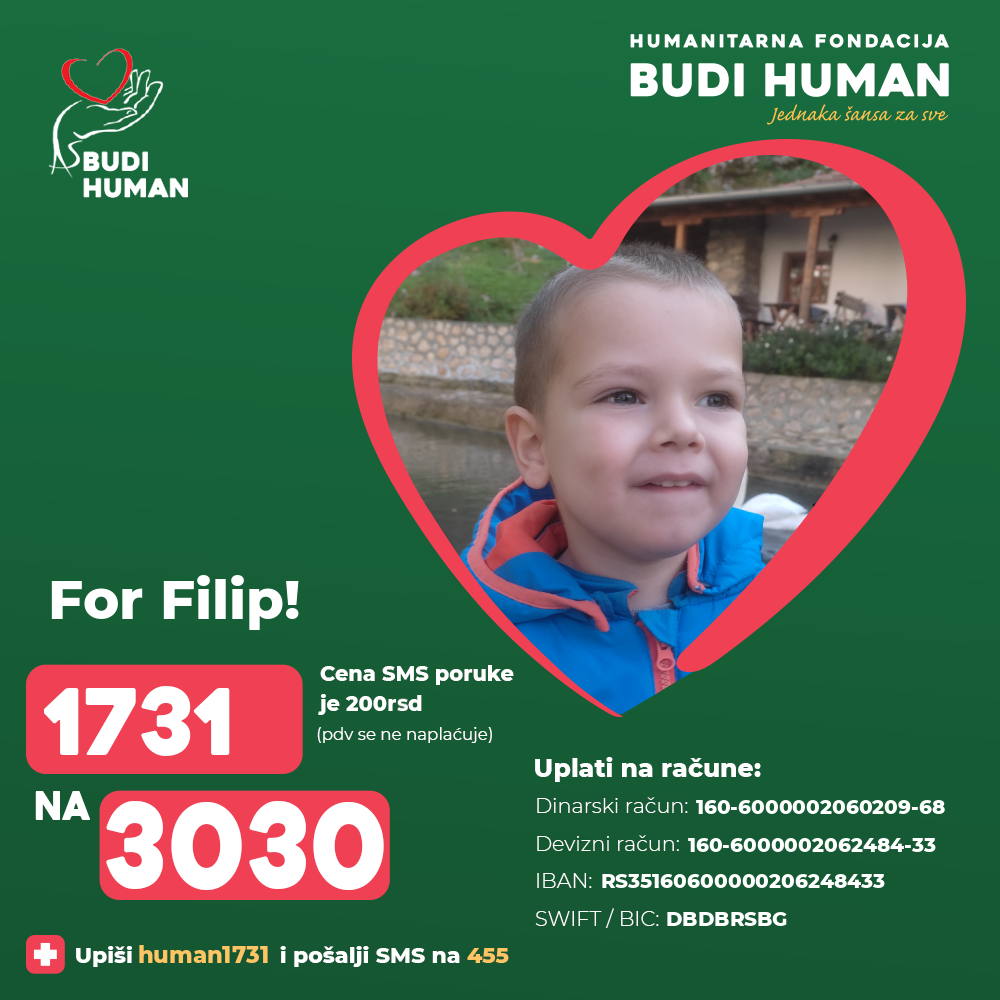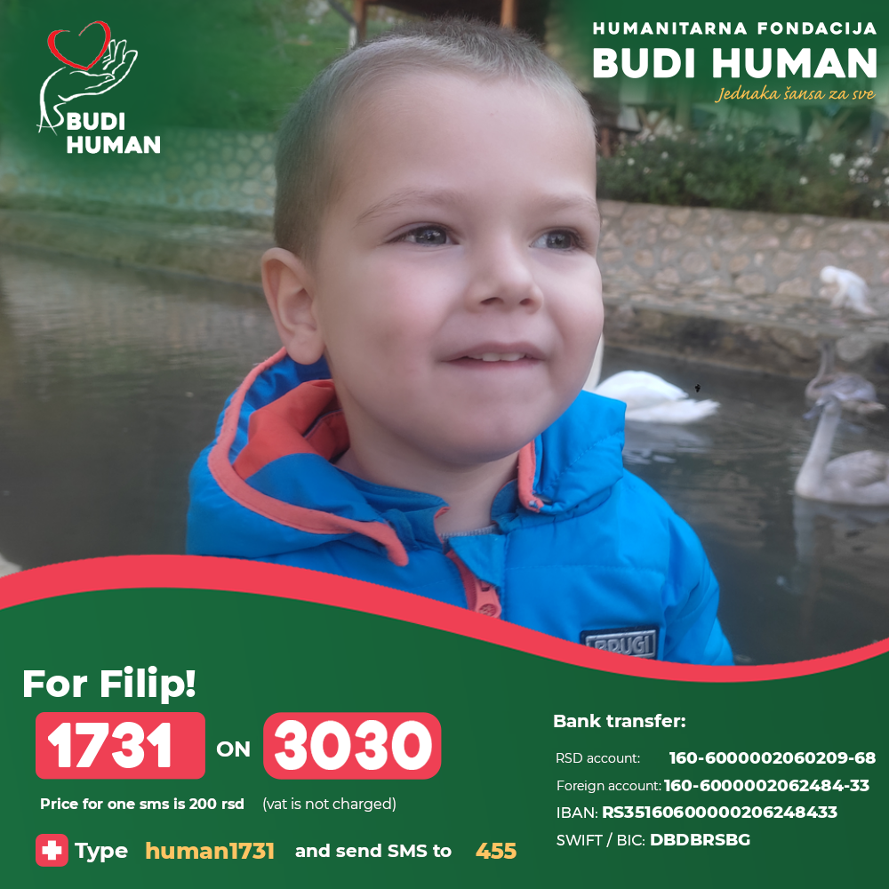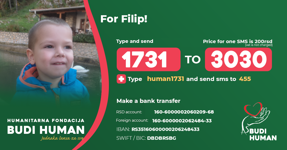 It is necessary for Filip to undergo stem cell treatments as soon as possible, which is very expensive, so the family appeals to all generous people to help with their donations in order to provide the funds needed for the treatment.