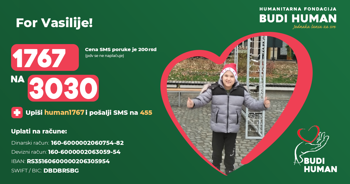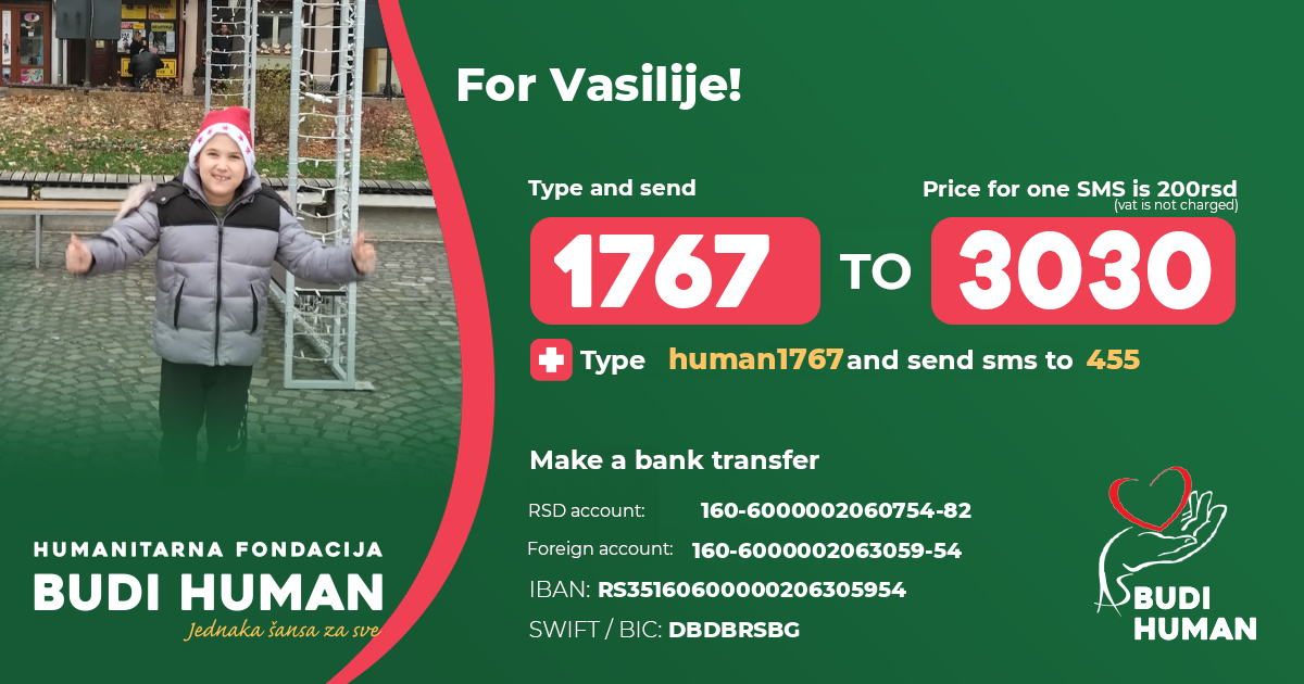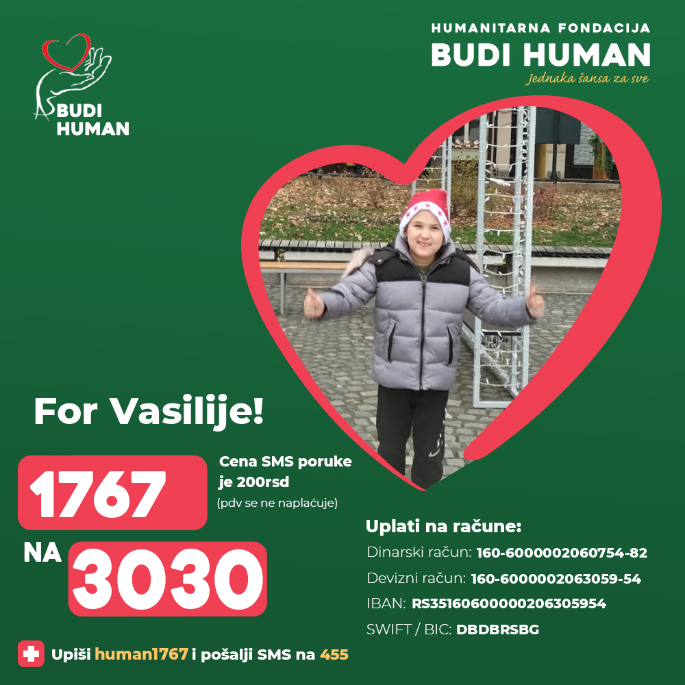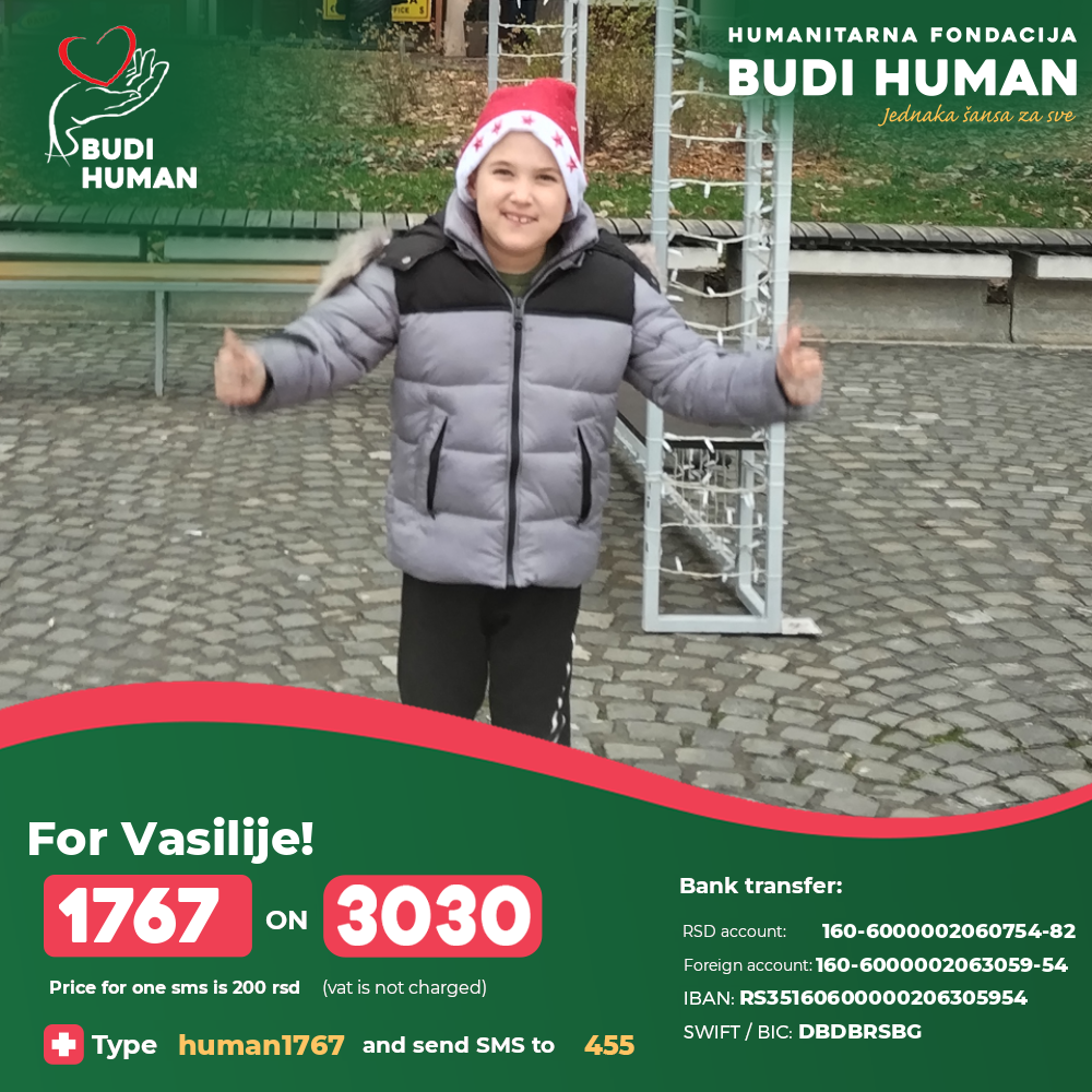 Vasilije suffers from Duchenne's muscular dystrophy (G71.0 Dystrophia musculorum) - a hereditary progressive muscle disease whose first symptoms appear in early childhood. In 2023, a molecular genetic test was performed and the diagnosis was confirmed.
