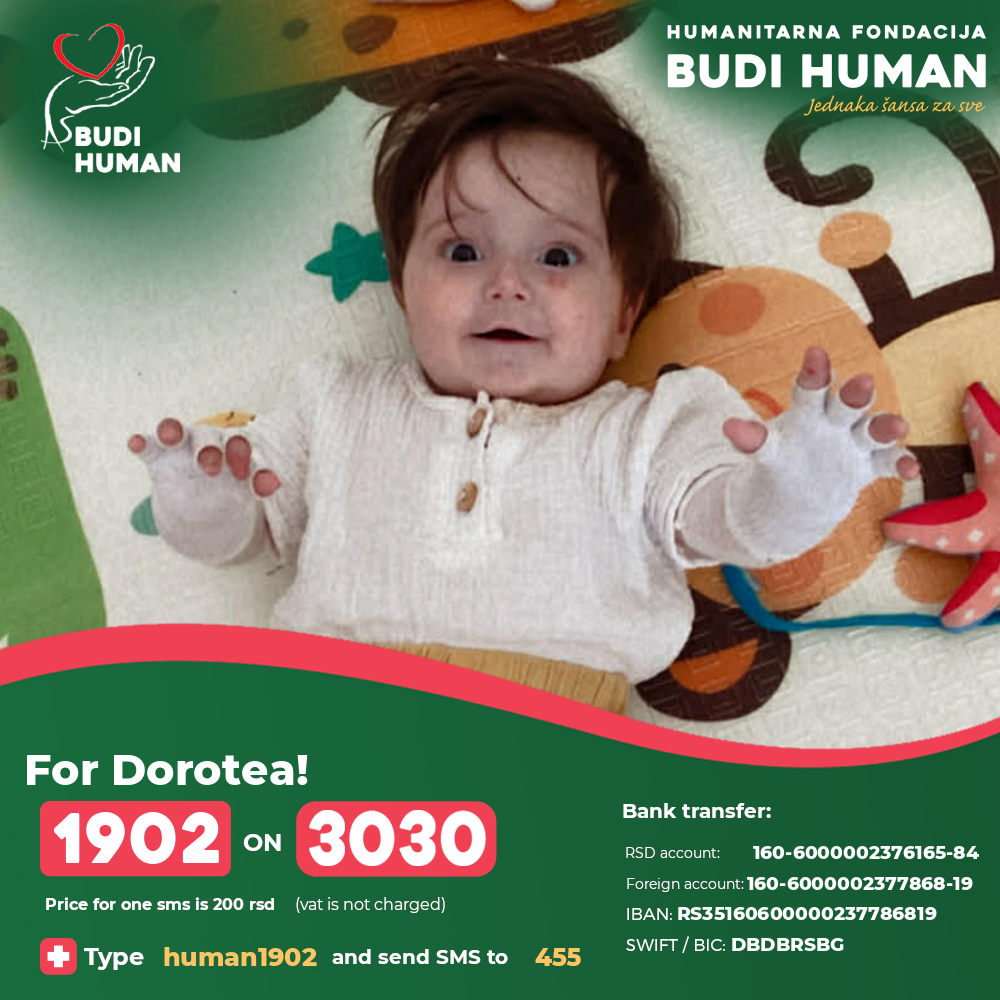Dorotea's skin is very sensitive, the slightest touch causes major damage. Due to frequent changes in the skin of her hands and fingers, Dorotea has no nail plate. Immediately after birth, there was a partial fusion of the toes of the left foot. Due to the wounds on her body, Dorotea is in great pain and significant financial resources are needed for gene therapy - the medicine Vyuvek, for which it is necessary to collect funds as soon as possible. The disease requires special care as well as frequent specialist examinations. Dressing is done every day and lasts several hours, and is necessary to prevent infections and additional complications.