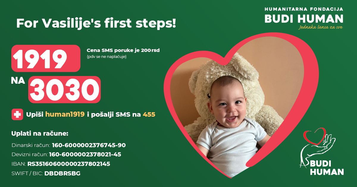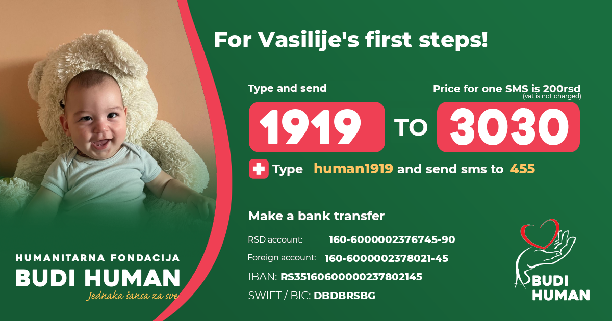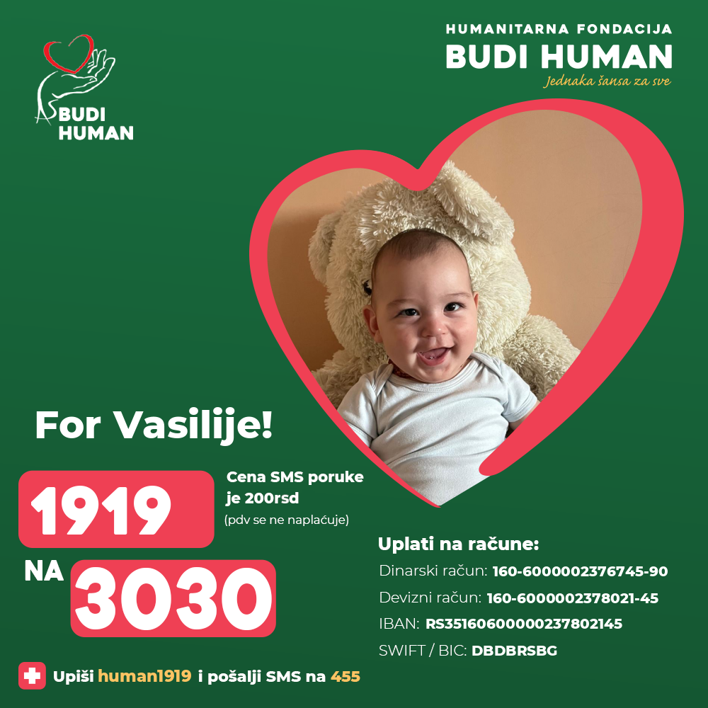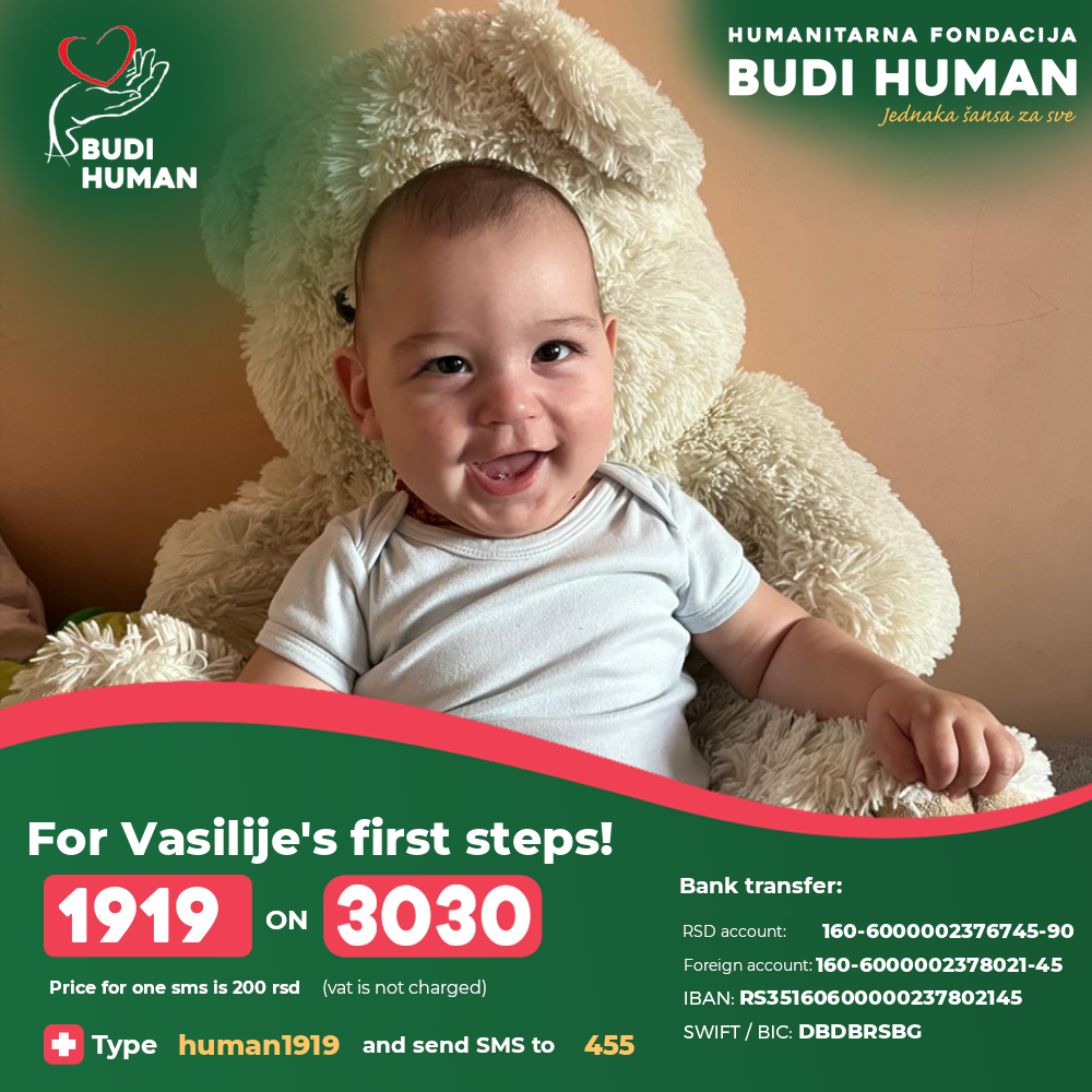 Vasilije was born in the 34th week of pregnancy with accompanying complications so he was diagnosed with cerebral palsy(G80.9 Paralysis cerebralis non specificata).