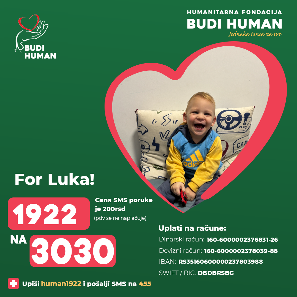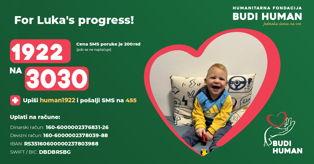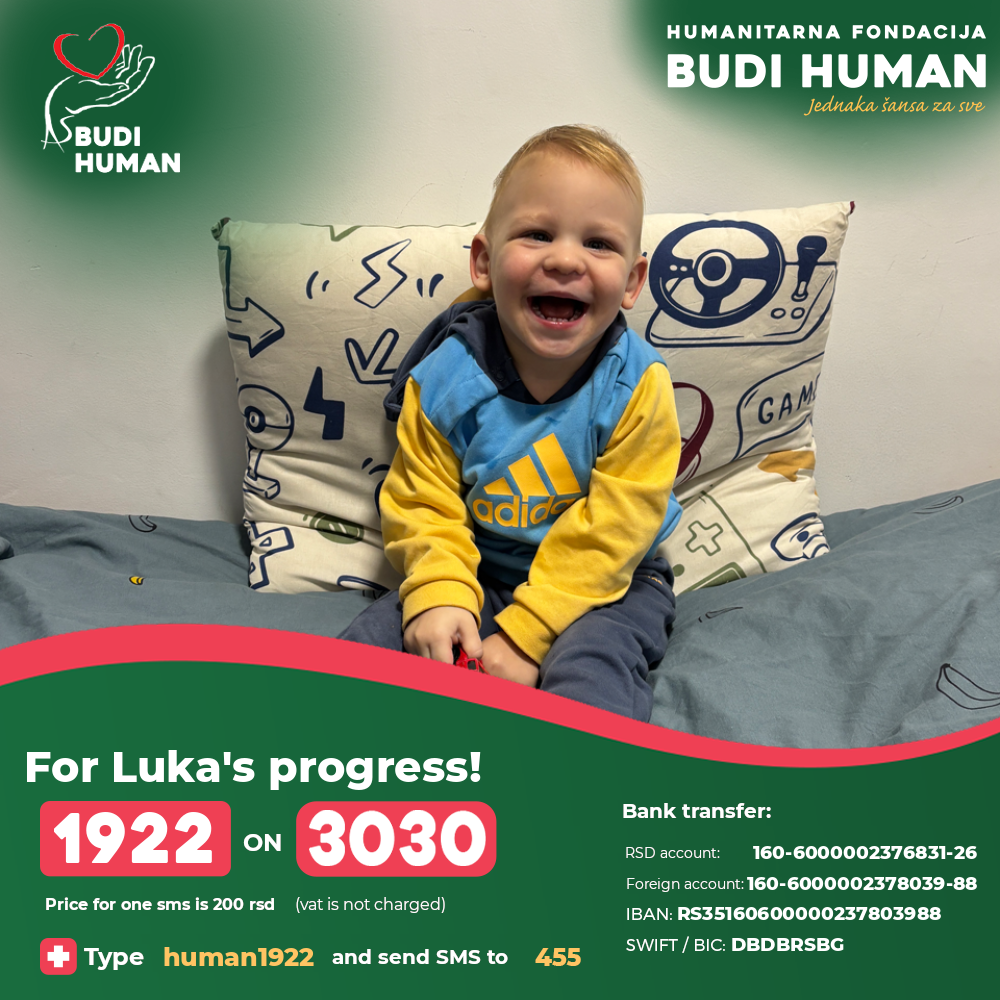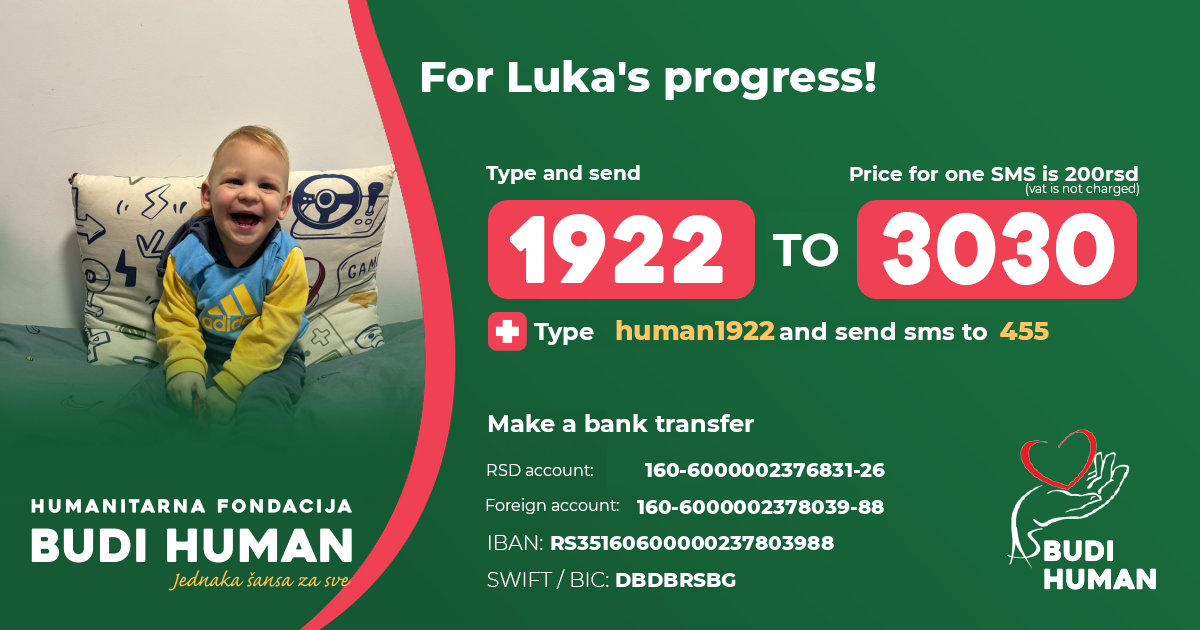 At the age of 3 months, Luka was included in intensive physical, occupational and hydrotherapy, while at the age of 20 months, the implementation of speech therapy treatments began. The plan is also to introduce defectological treatments. In the following period, intensive work is needed to improve sensorimotor abilities. Considering the high costs of therapy and rehabilitation, humane people’s donations are necessary.