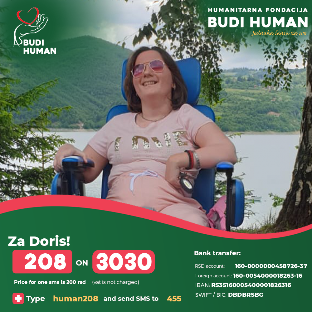 Doris je rođena 25.05.1991. godine. Do danas ona je zatočenik kuće i tame. Naime, Dorisi su usled ozbiljnih komplikacija na samom rođenju dijagnostikovane – cerebralna paraliza i epilepsija.