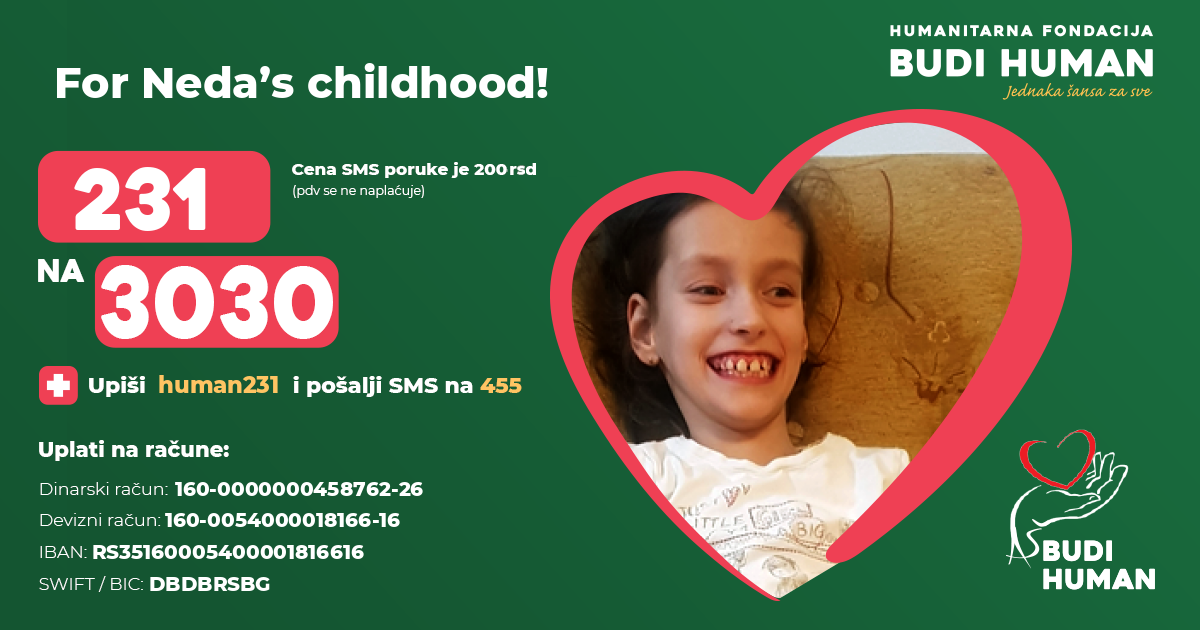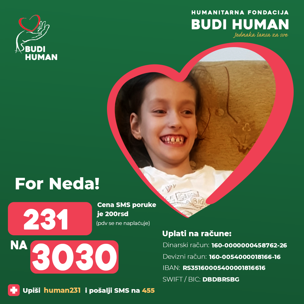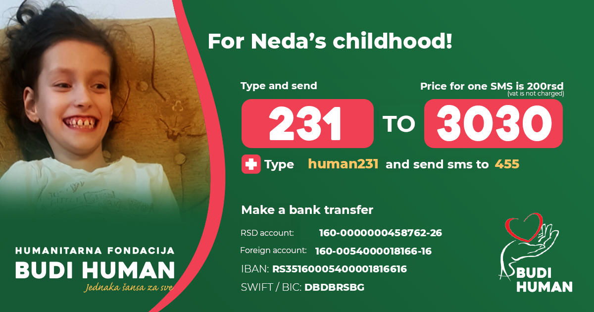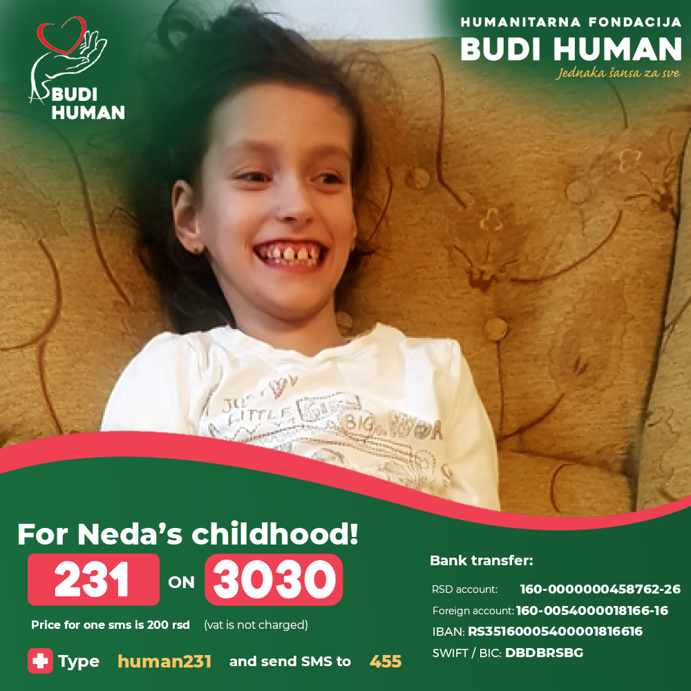 But, in order to improve her situation, she needs our help. It is necessary for Neda to have several transplantations of stem cells, tendon surgery and rehabilitation.