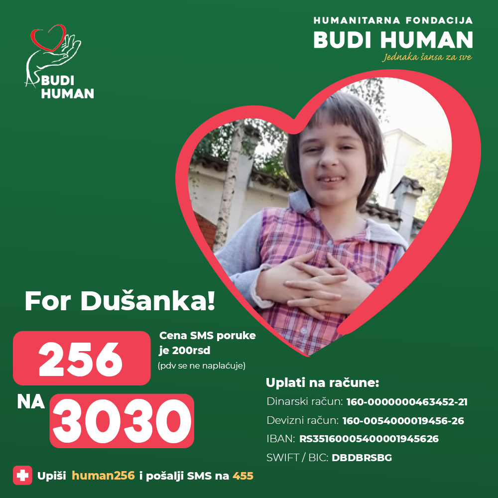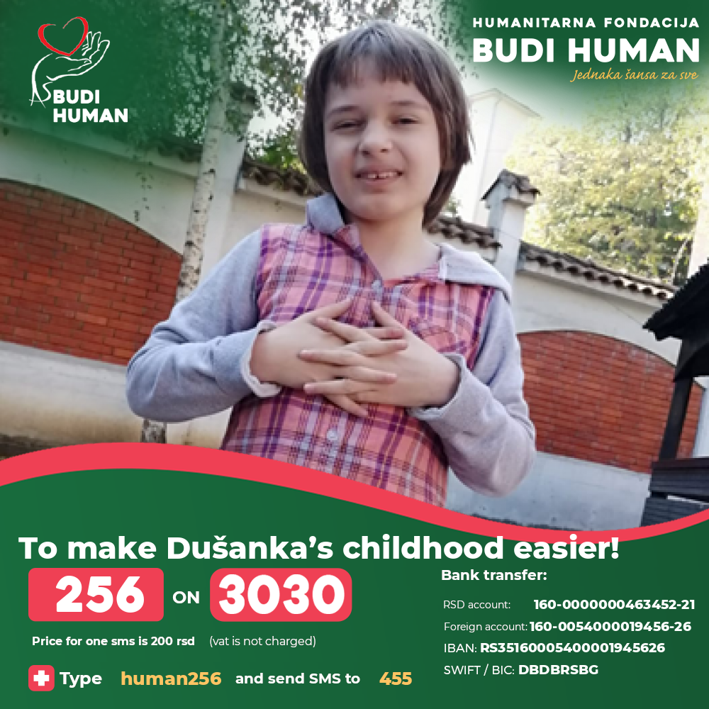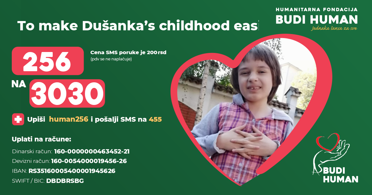 Let’s help Dušanka to be part of the Day care for children with disabilities again and raise donations for medicines and special nutrition that she needs. Type 256 and send an SMS to 3030. You can help this little girl by making payments to her RSD or foreign currency account, or you can donate online by clicking on the link e-doniraj.