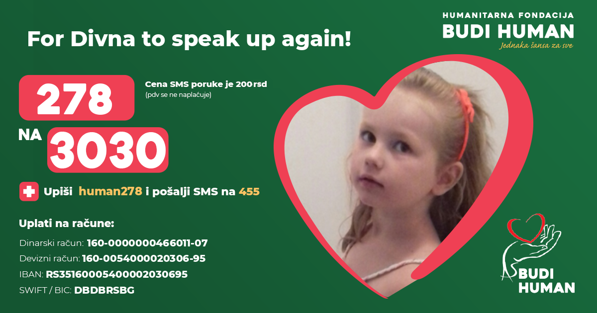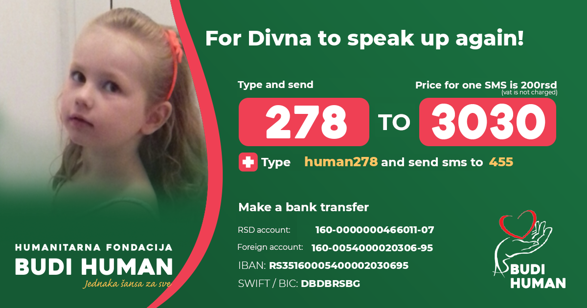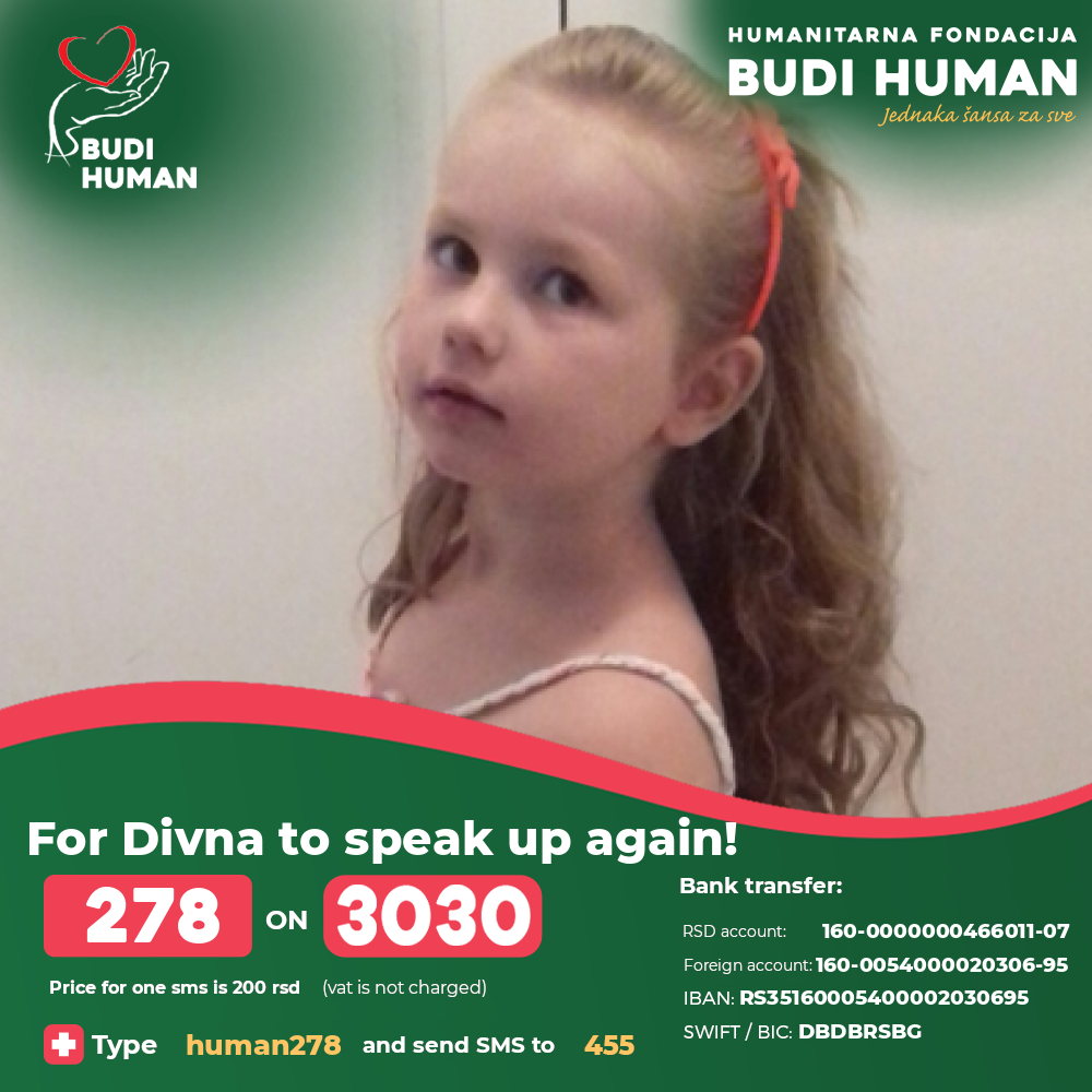 In order to get her voice back, she needs continuous logopedic treatments. Because of the difficult financial situation in which her parents are, they cannot afford an adequate treatment.
