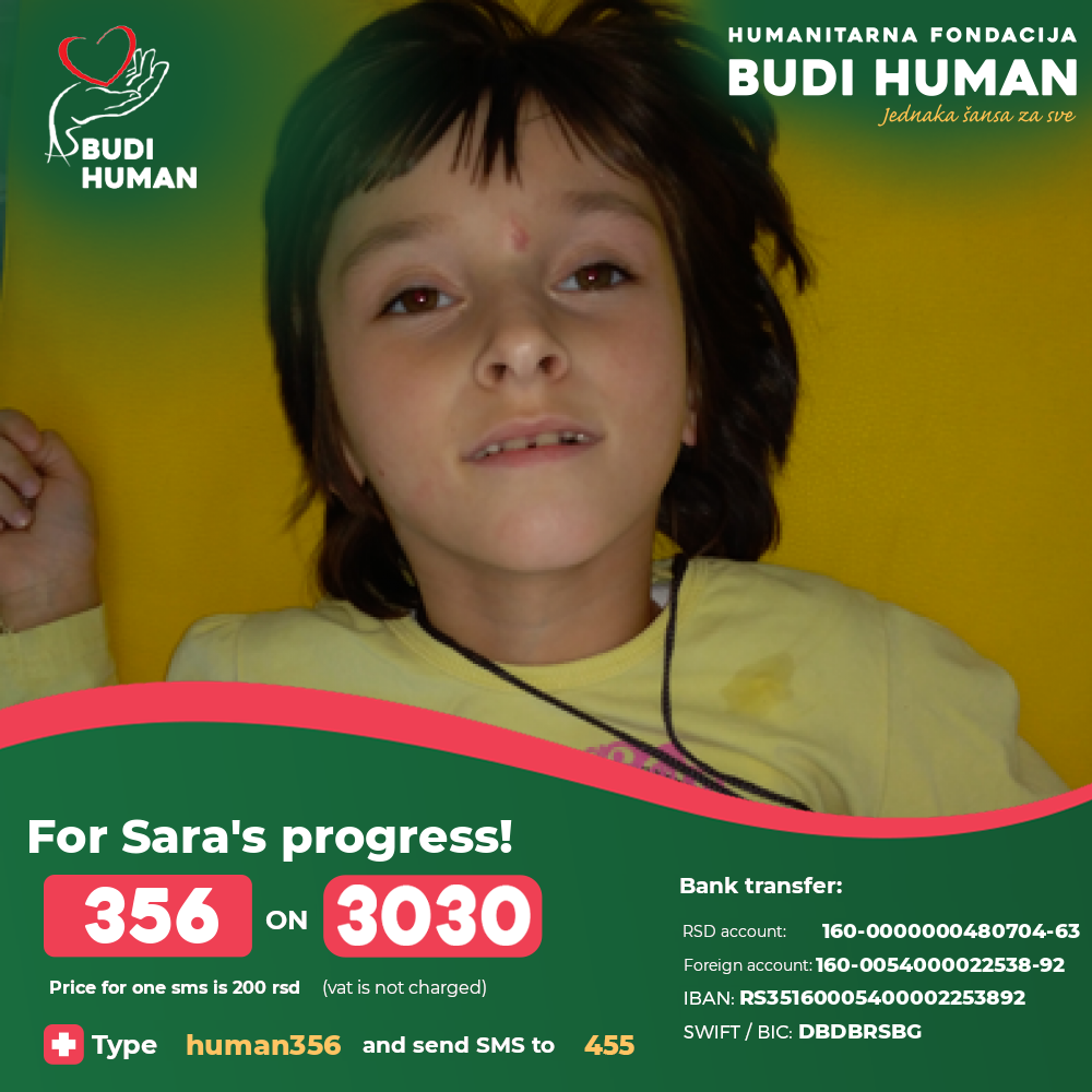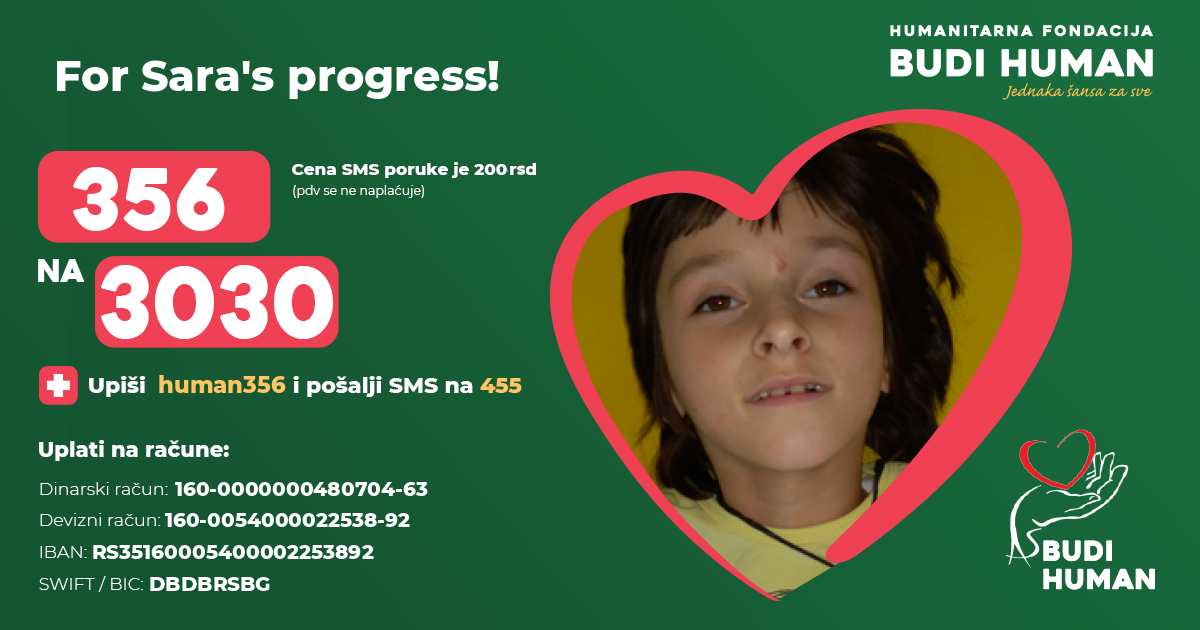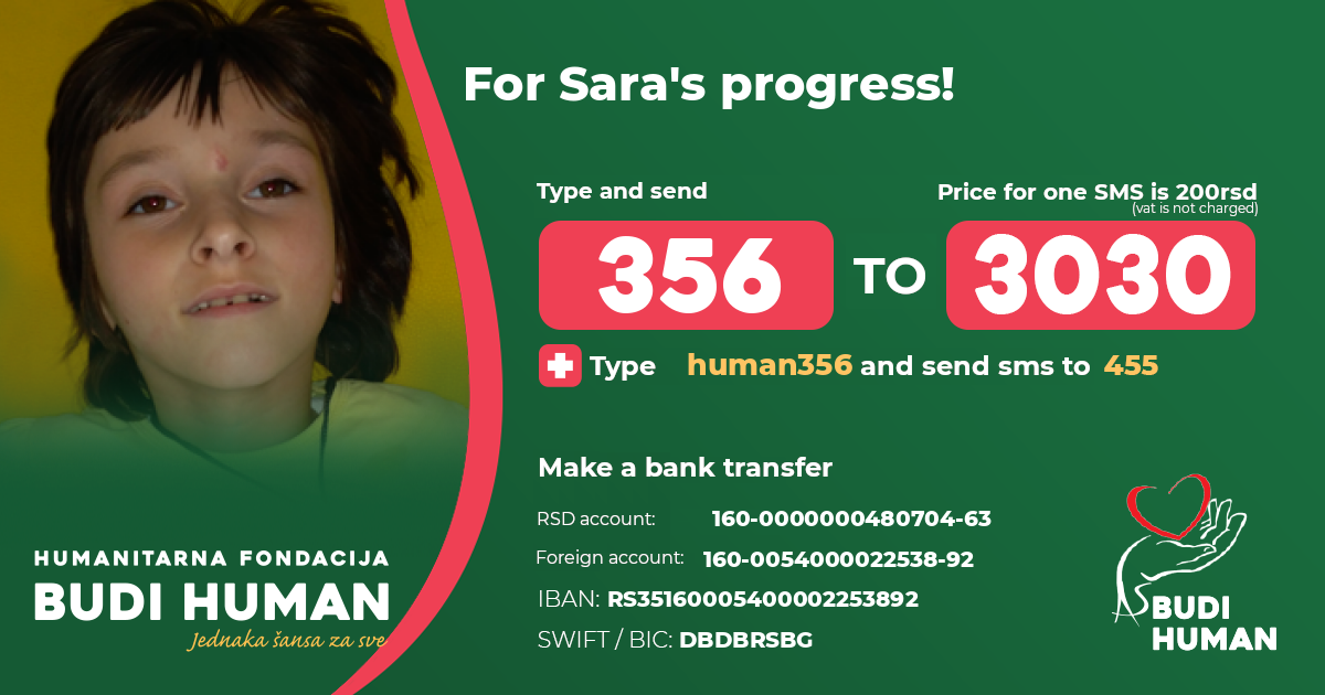 Her self-movement is very limited, since she has a fifth degree of damage. She cannot walk or talk, and Sara's backwardness in psychomotor development is evident and clearly expressed in relation to her peers. But this little fighter from birth has the incredible strength and persistence, and all those difficulties do not prevent her from having her childhood as the other children - she successfully finished the first grade of a special elementary school.