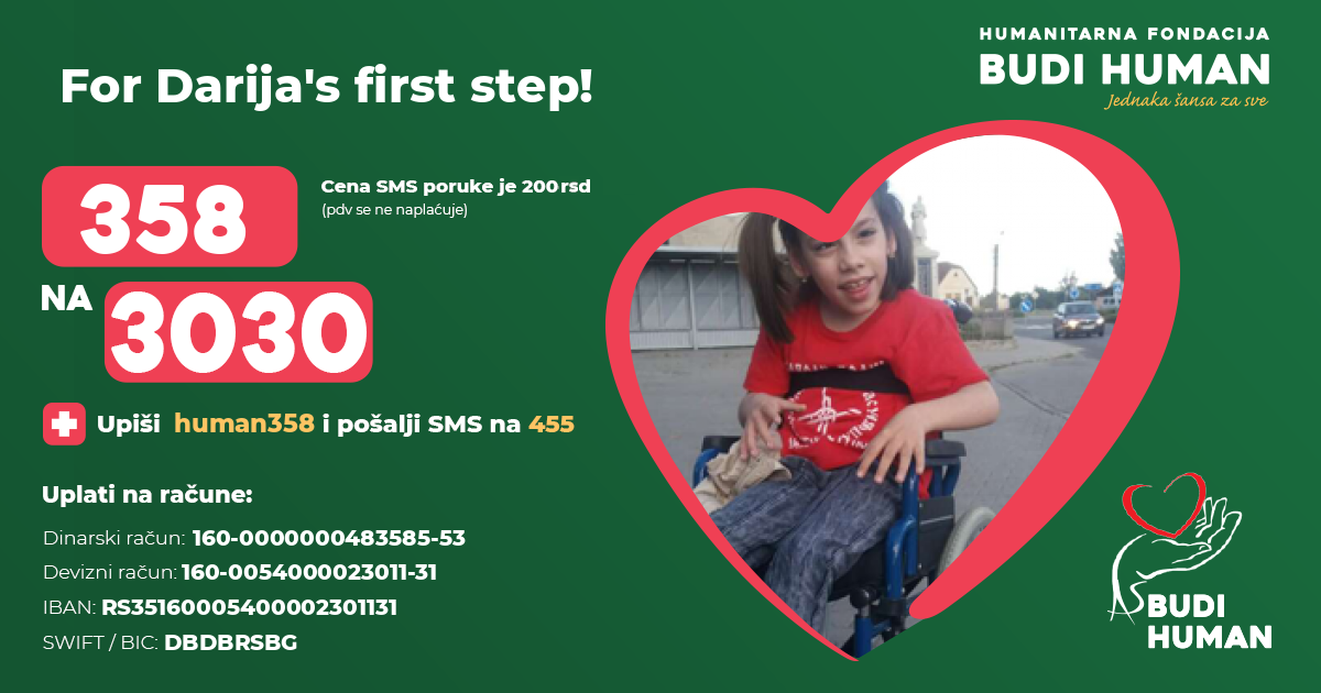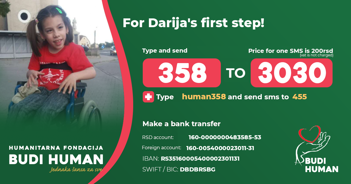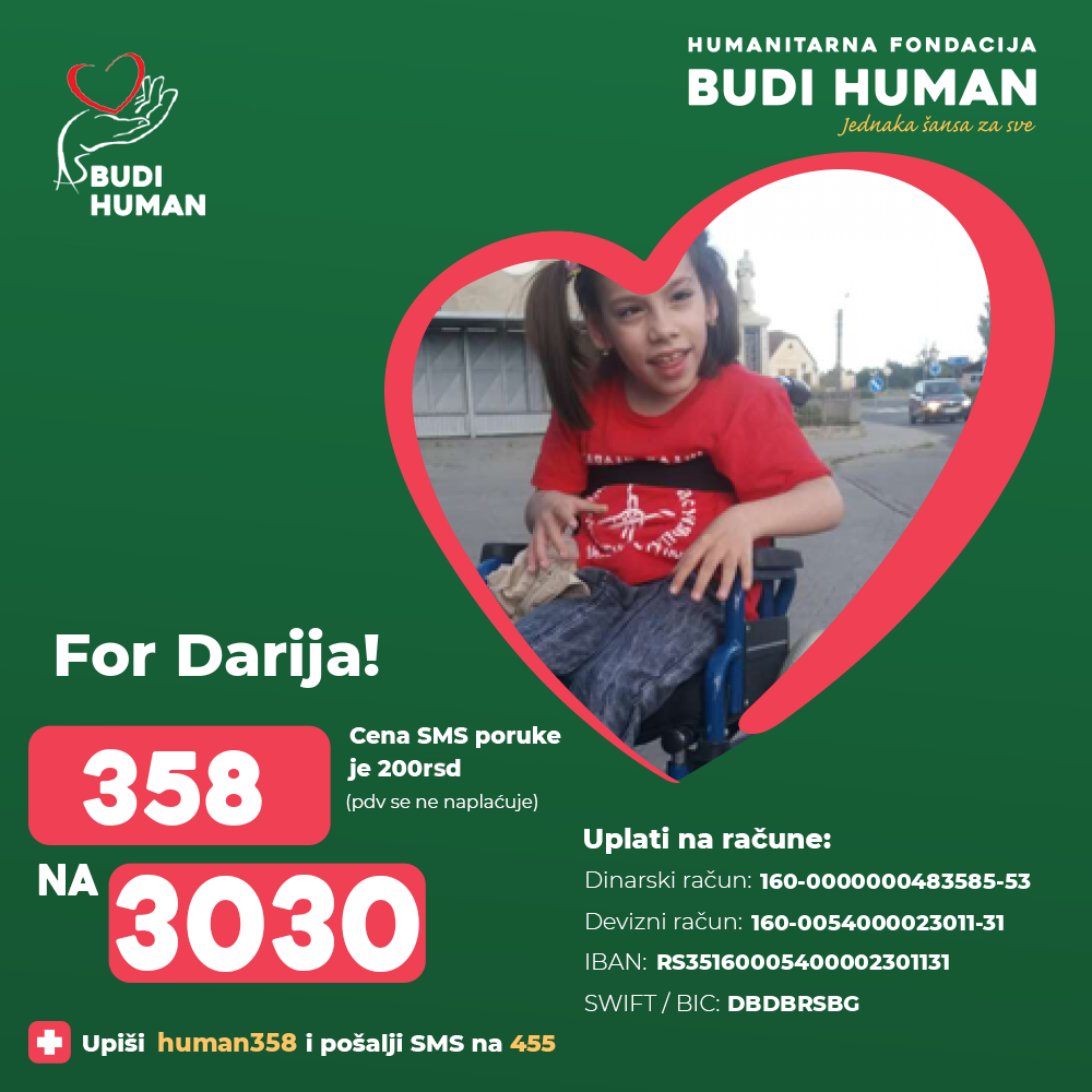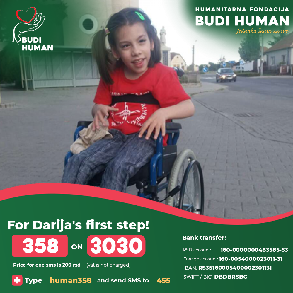 Darija is intellectually preserved, speaks but she cannot walk or sit for a long time without support. There is a long-standing process that consists of operations, rehabilitation, equipment and further treatment for which the family has exhausted all funds.