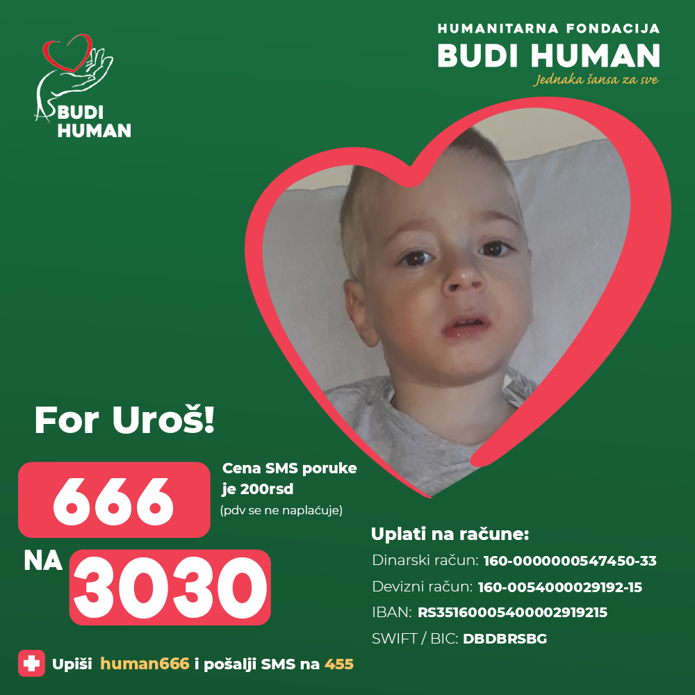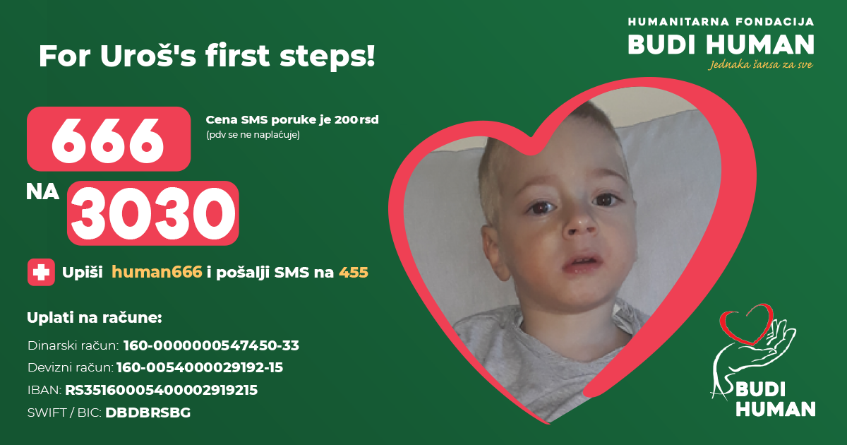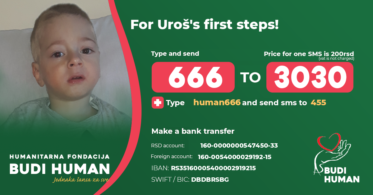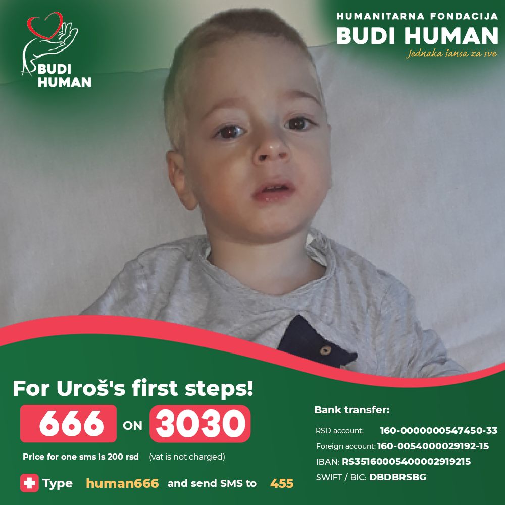 Recently Uroš’s parents got to know that there were rehabilitation centers in Slovakia and Austria that could help him make the first steps. Also, Uroš needs funds for a therapist, defectologist and speech therapist too.