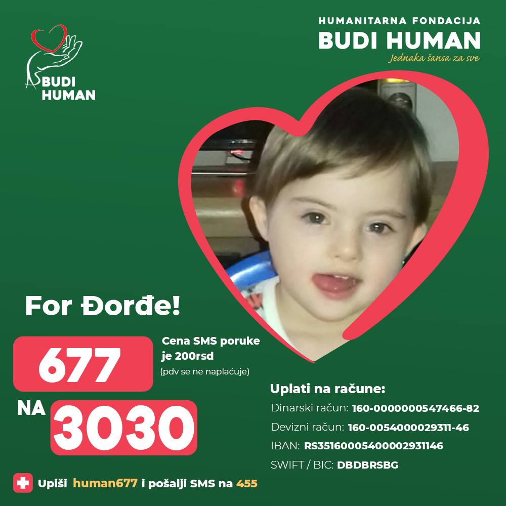 Đorđe started walking with two years and three months, but he is still unstable and insecure and he can not speak. He goes regularly to a nephrologist, neurologist, physiatrist, psychologist, defectologist, oligophrenologist and speech therapist. He needs daily intense logopedic, defectologic and physical treatments in order to fully develop his own biological capacity. Unfortunately, all this requires a lot of money that the family is not able to provide so that Đorđe can have a chance to play with his friends and communicate in a way his friends and family can understand him.