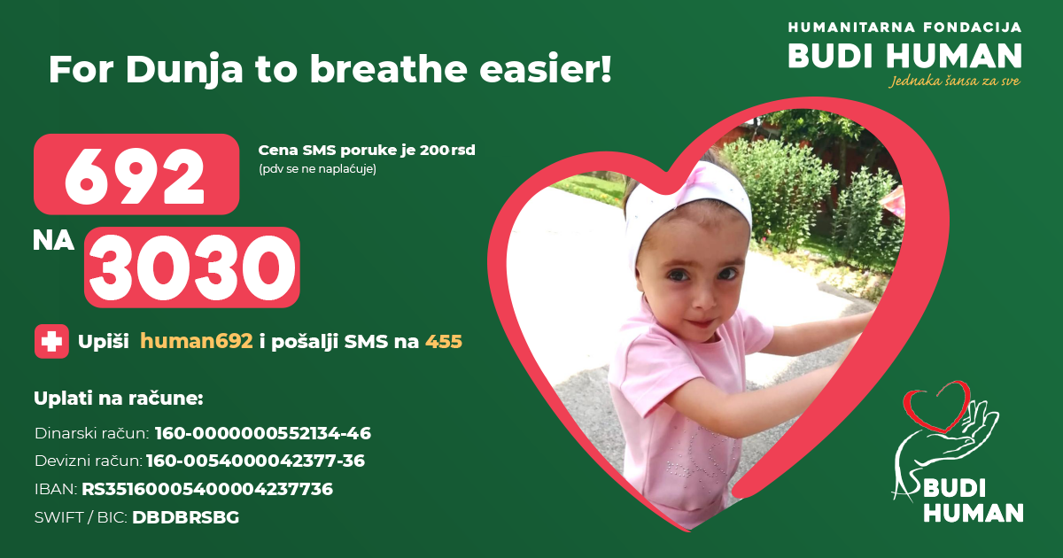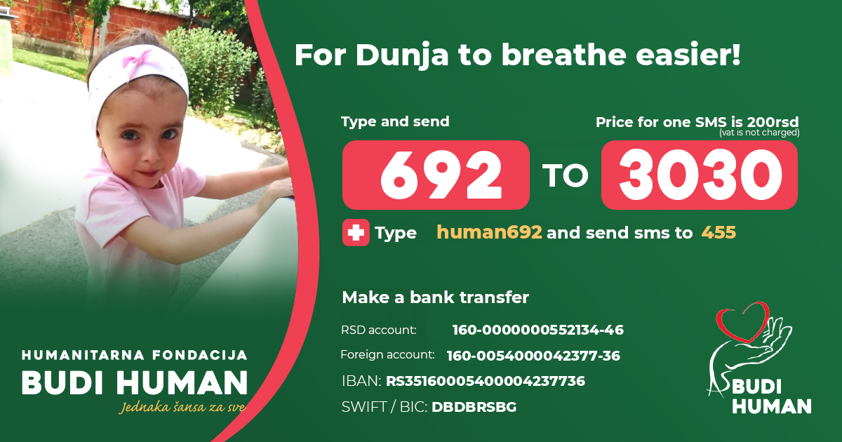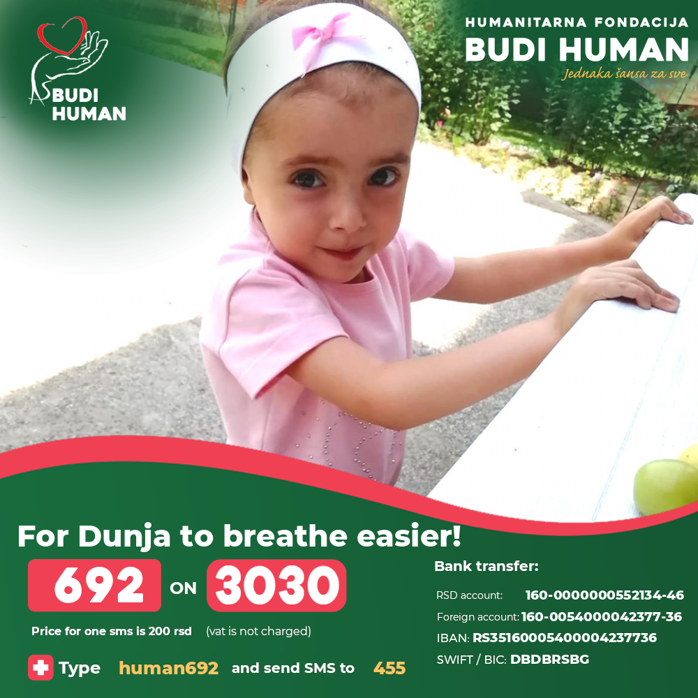 Dunja needs a mechanical insufflator-exsufflator Cough Assist E 70 Respironics to accelerate the expulsion of mucus from the lungs for easier breathing, so that she can develop better in general. She also needs funds for heart surgery.