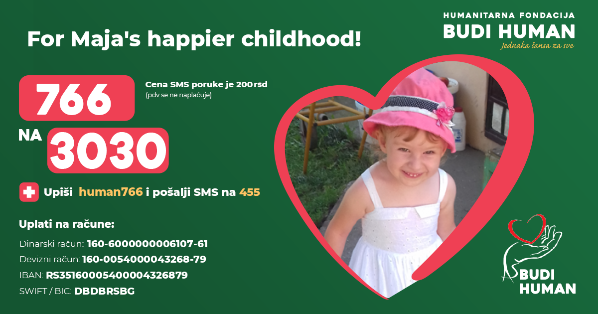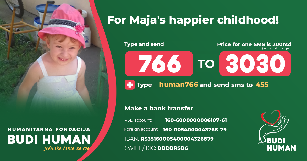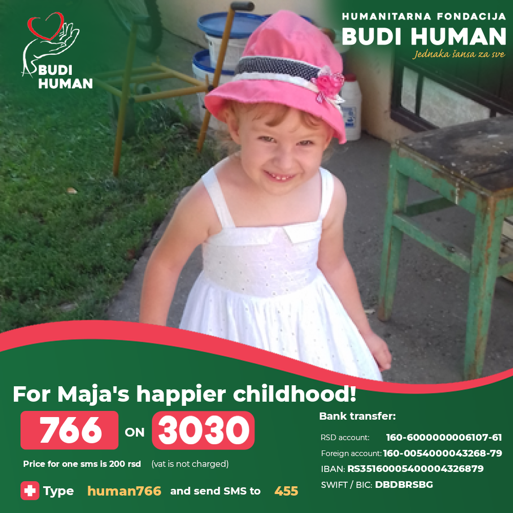 In order to progress and reach her peers, she needs help. Maja goes to speech therapies every day except for the weekends in order to speak up. She needs work with a defectologist, individual exercises for the development of gross and fine motor skills and music therapy. All this should have a positive impact on her development. But all these treatments require money.