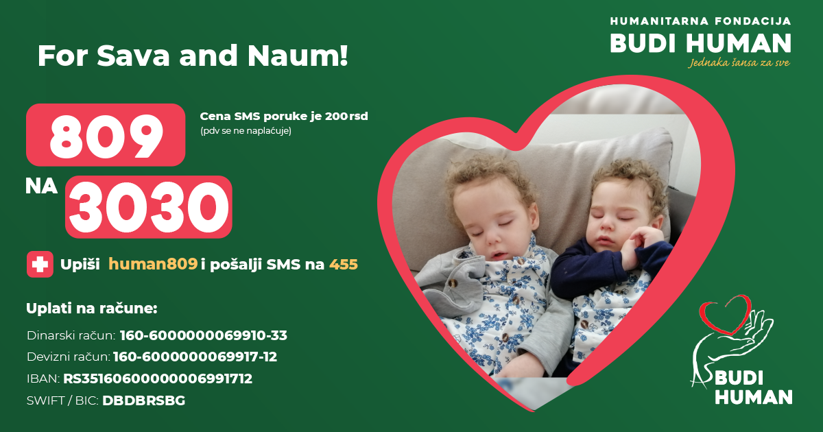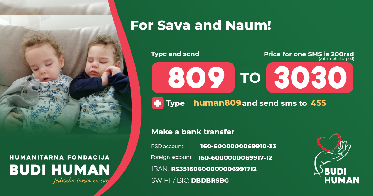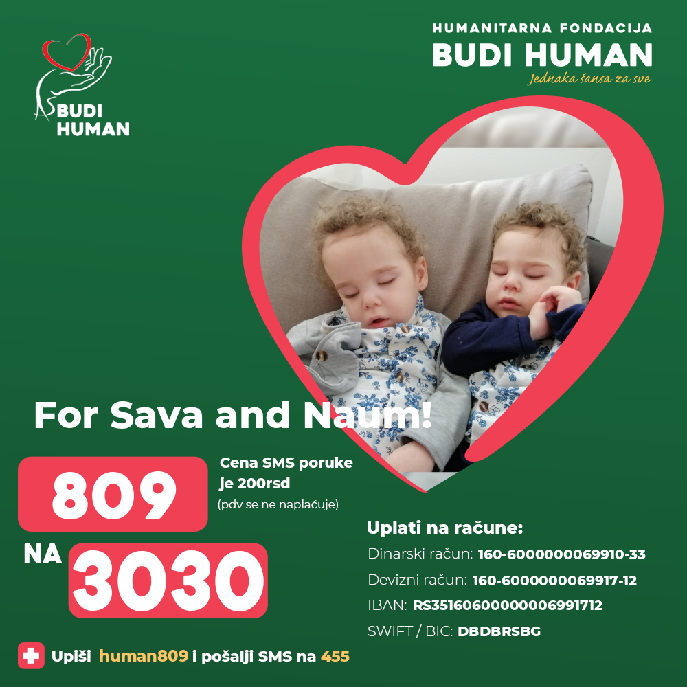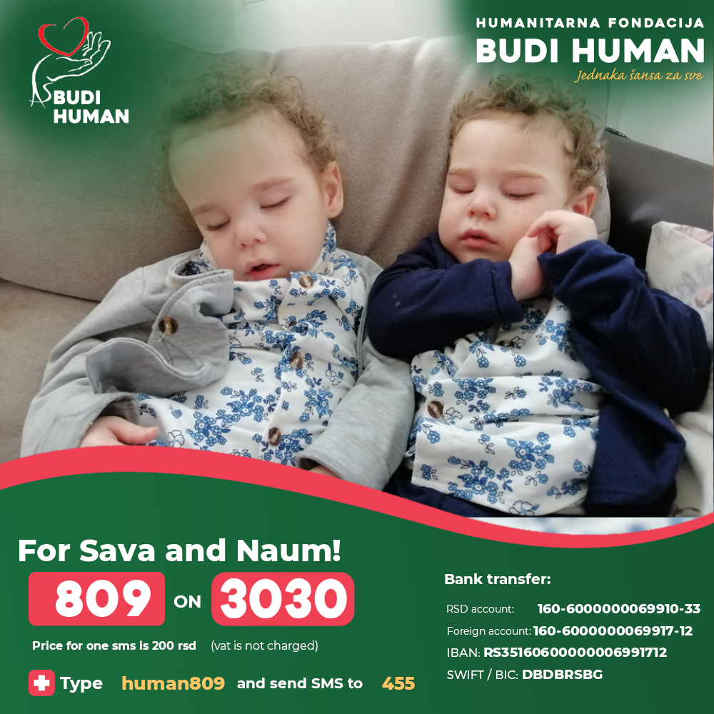 Sava and Naum can not move their heads and cannot turn around and sit. They need funds for physical therapies, special education and speech therapy treatments, for stem cell surgery abroad, for medicines, supplements and medical supplies, contact lenses, specialist examinations and diagnostics.