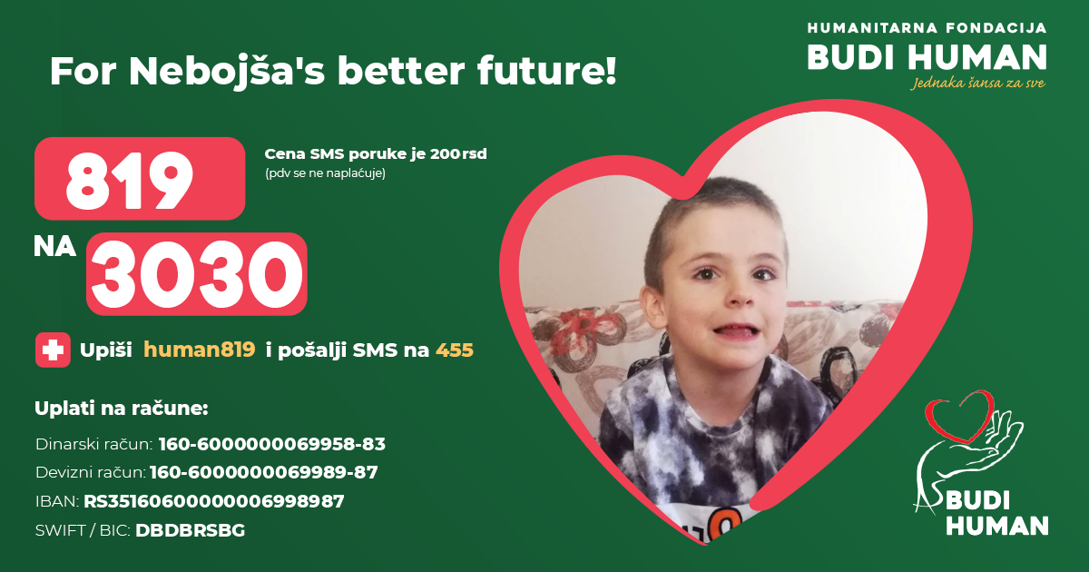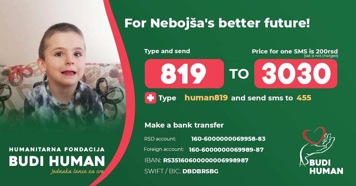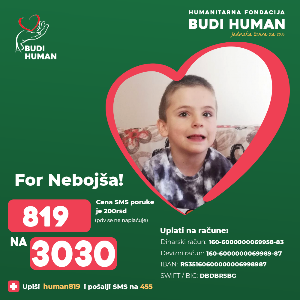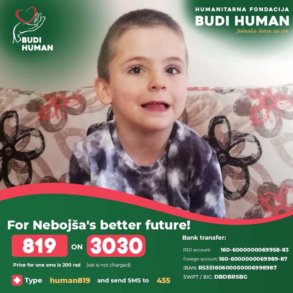 Nebojša was born after a regular pregnancy that ended in the 34th week. On the same day, he was transferred to the Institute of Neonatology, where he was treated for a month. After that, he was treated at the hospital for cerebral palsy in Banja Koviljača spa. In the second year, he was diagnosed with cerebral palsy.