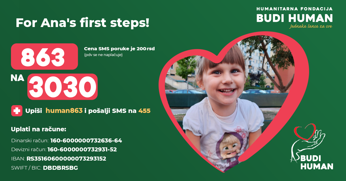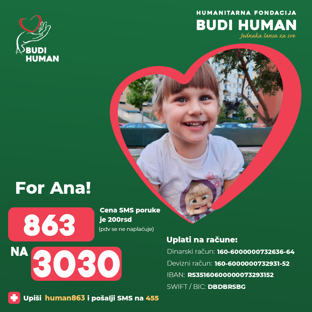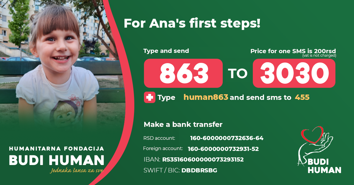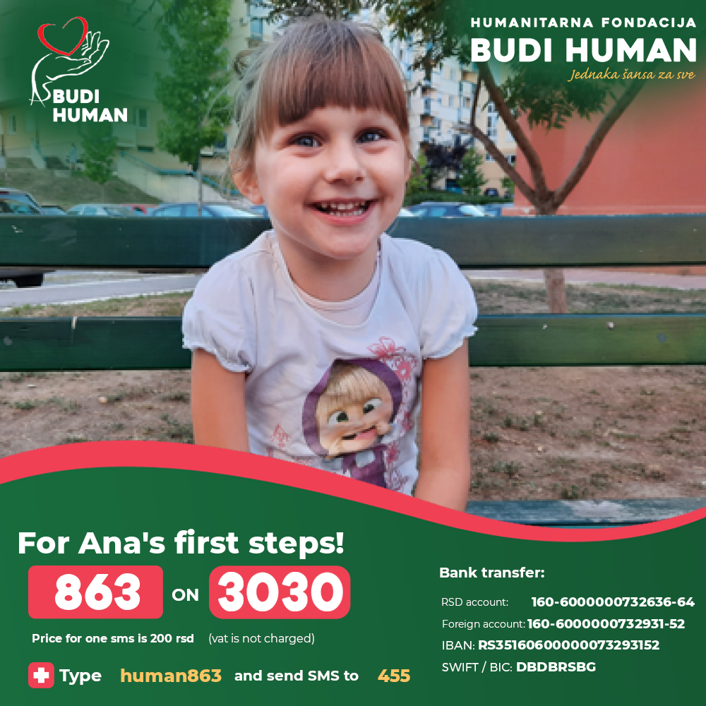 Unfortunately, she is far behind her peers. That is why she needs daily physiotherapeutic treatments and treatments for fine motor skills. Ana needs work with a speech therapist, orthopedic aids, treatment services, spa rehabilitation and funds to cover accommodation costs.