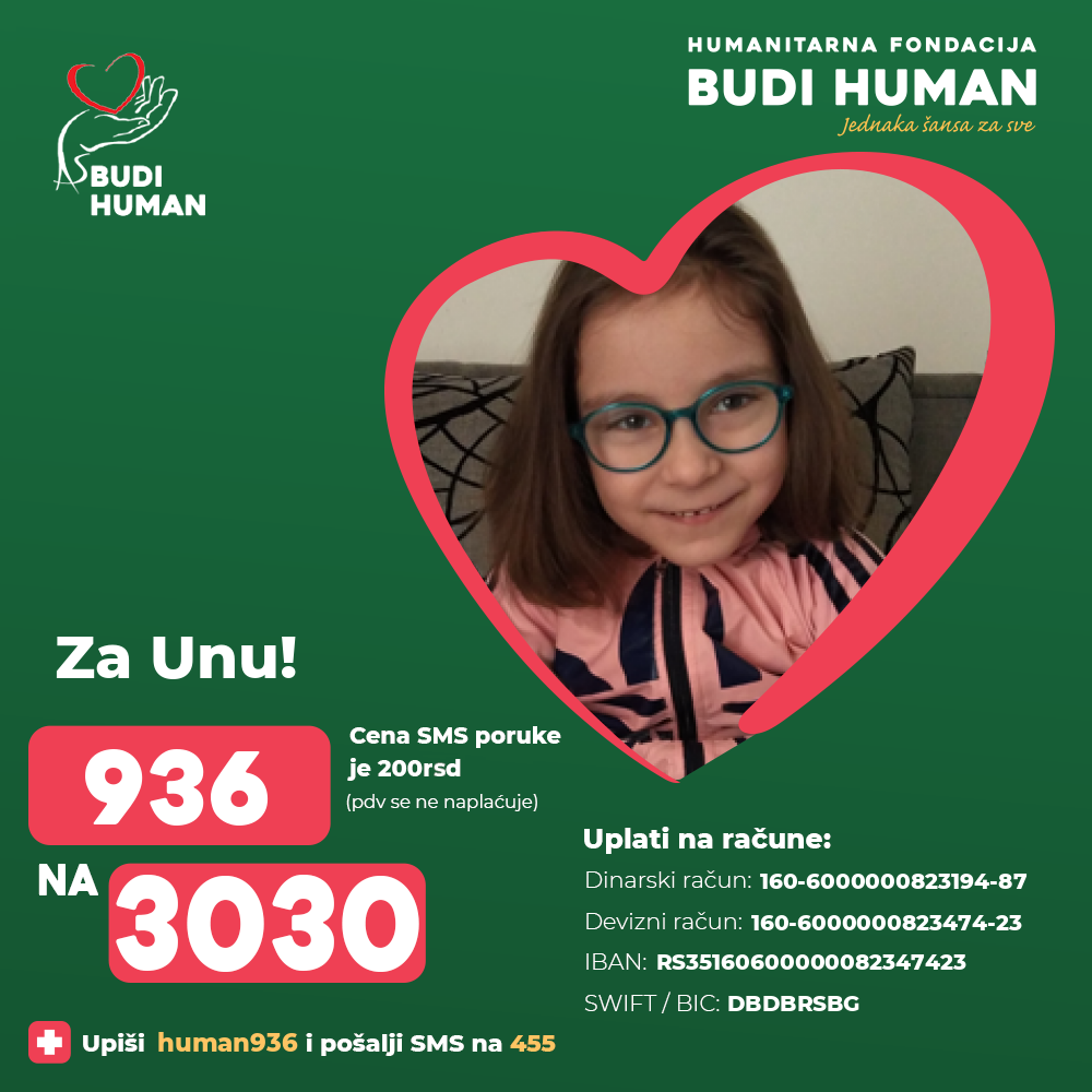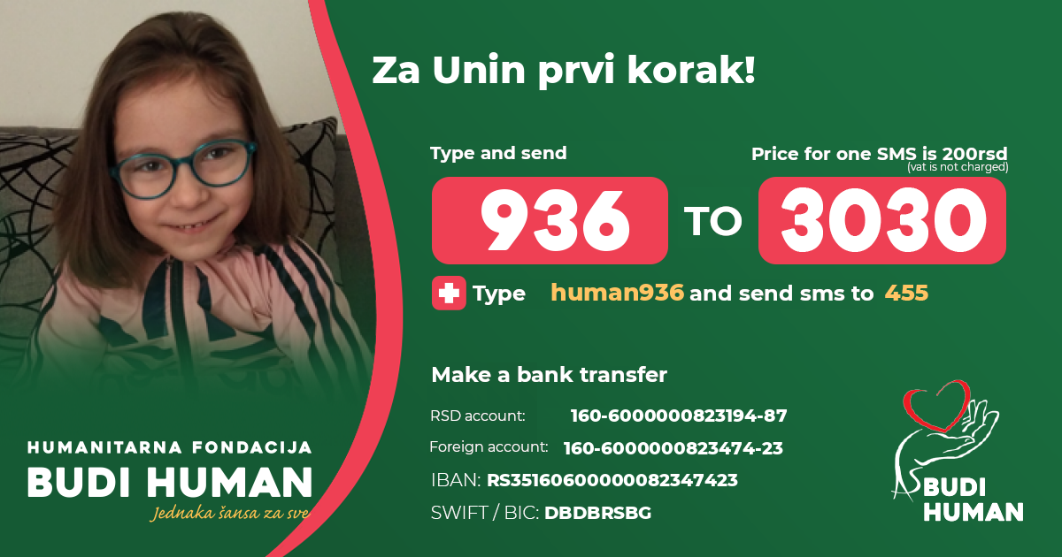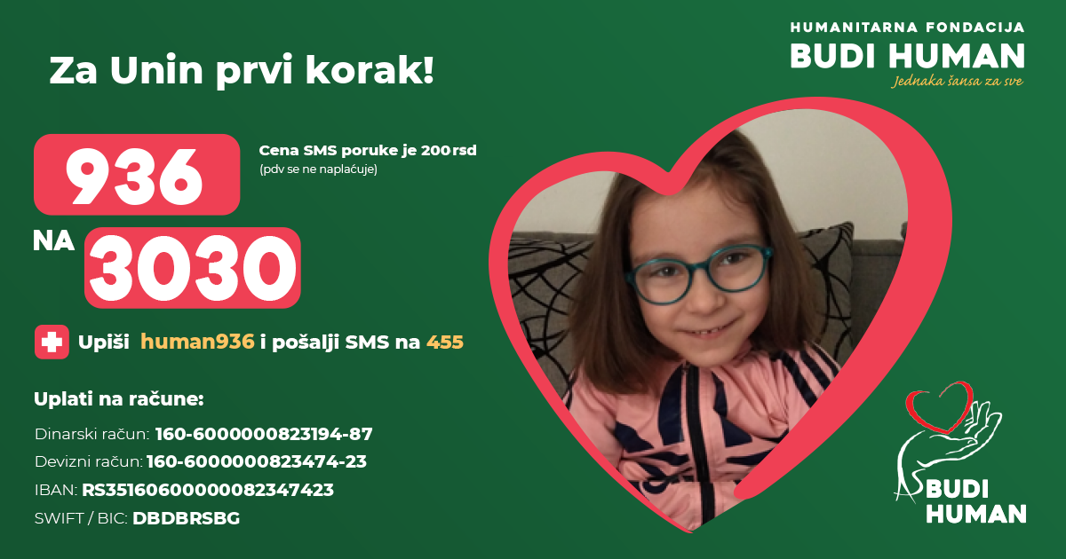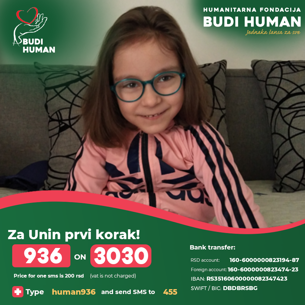 Pomozimo Uni da stane na svoje noge, da napravi svoje prve korake i da kao njeni vršnjaci umesto u bolnici, detinjstvo provodi igrajući se sa drugom decom. Za to su joj potrebne svakodnevne fizikalne terapije u zemlji i inostranstvu. Potrebna su joj sredstva za operacije, specijalističke preglede, ortopedska pomagala, banjsko lečenje kao i za putne troškove i smeštaj. Do sada je porodica samostalno sve finansirala.