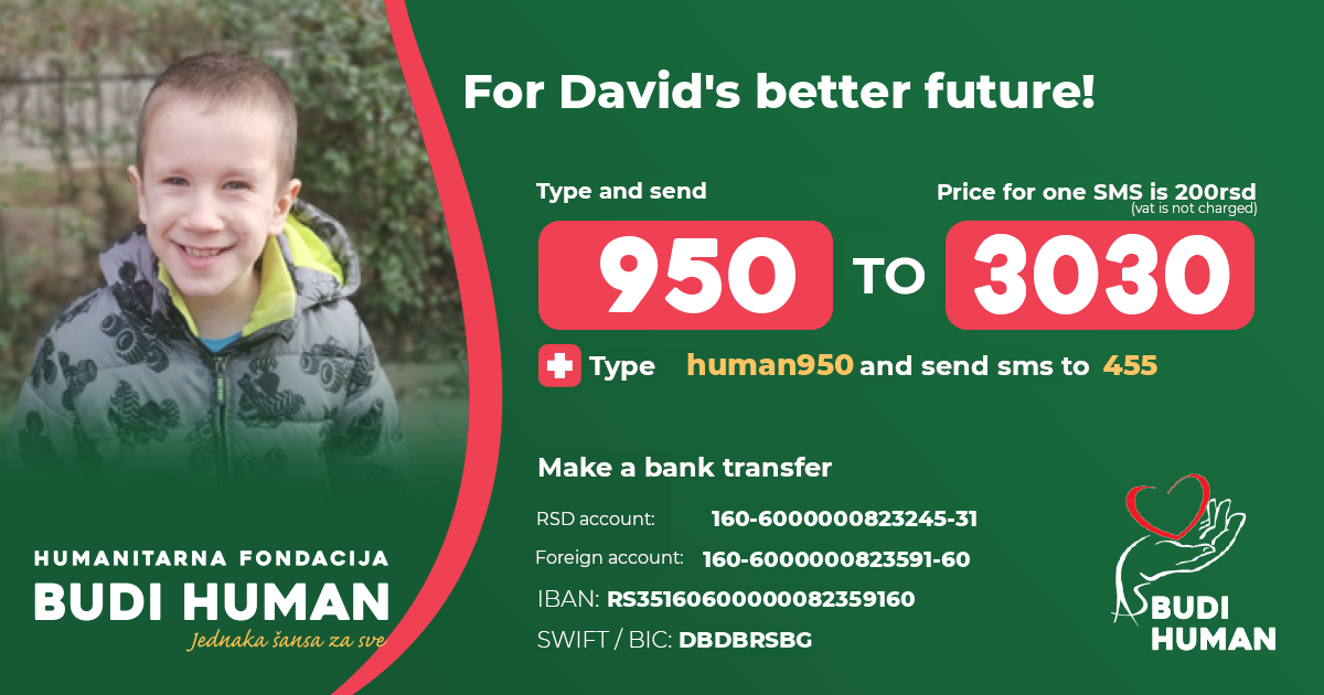Since then, David has been going to speech therapy, defectology treatments, re-reduction of psychomotor skills and psychotherapy. Therapies gave certain results. David is a cheerful and smiling boy who needs just a little bit to be like his peers.
