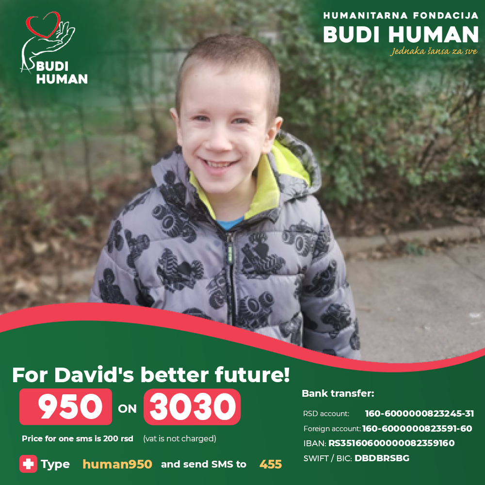The family is no longer able to finance David's treatment because the costs are high and only his father is employed, for that reason we all need to help and enable David a better future.