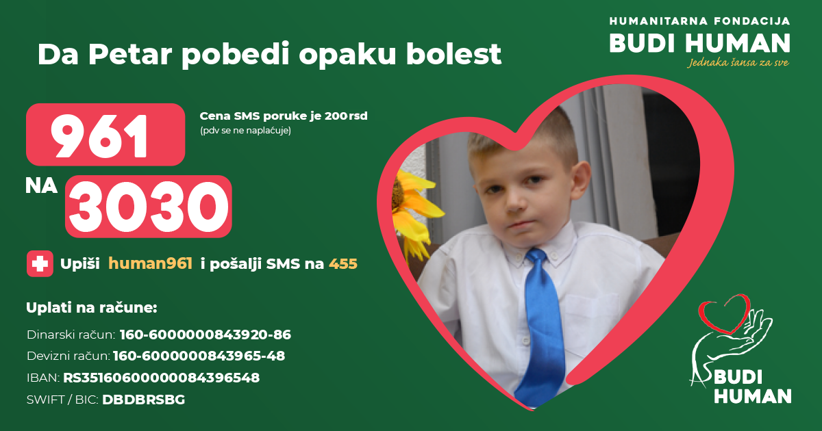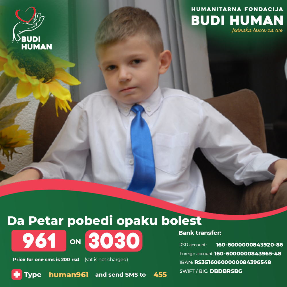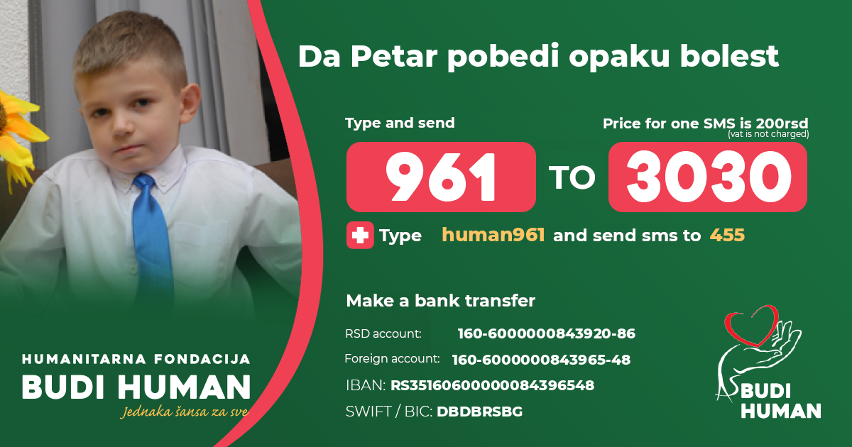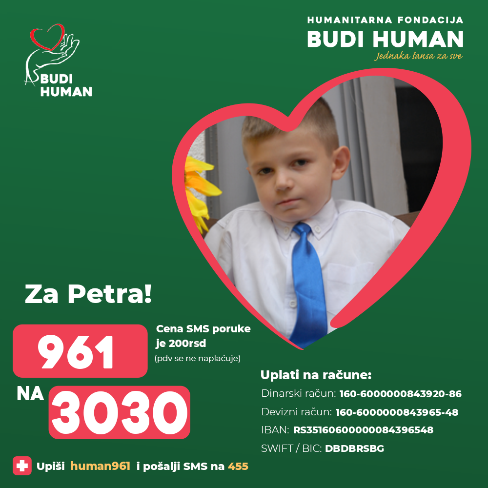 Roditelji se obraćaju dobrim i humanim ljudima da pomognu, da Petar ode na lečenje u inostranstvo koje će mu vratiti pravo na detinjstvo i život.