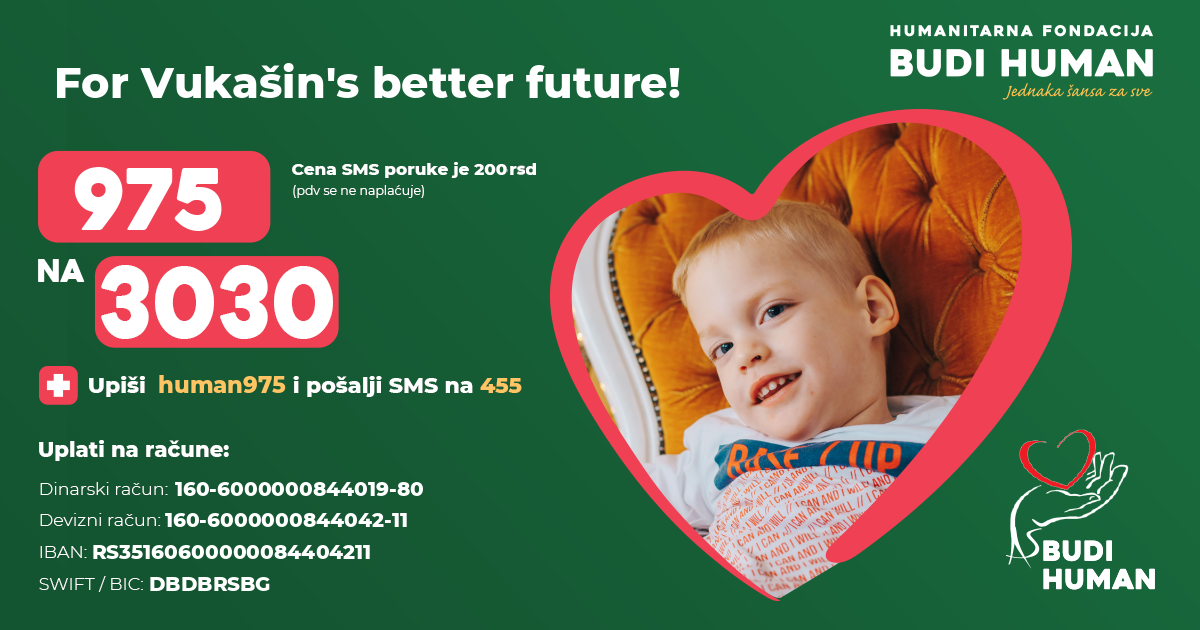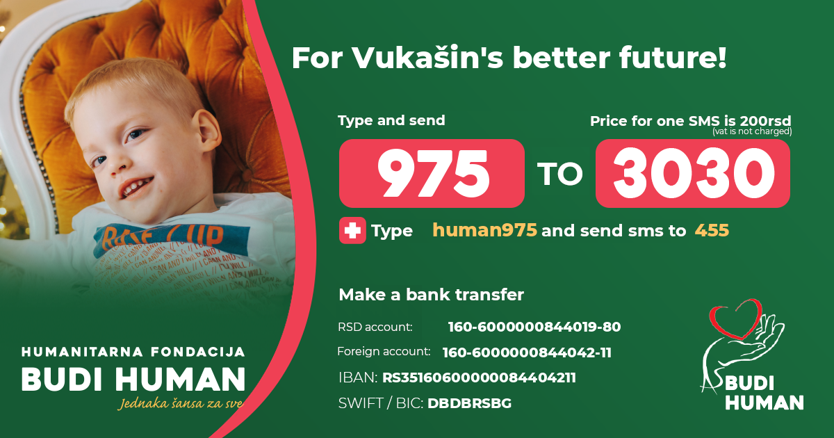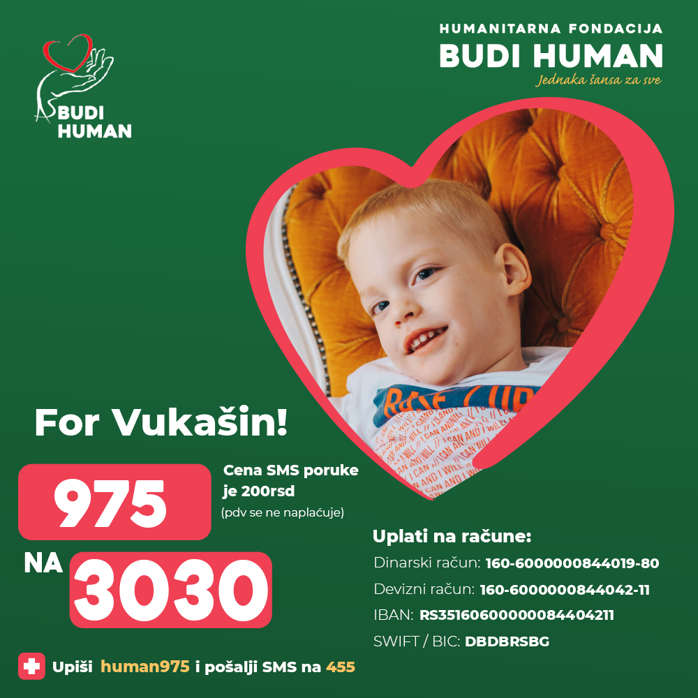 Vukašin's older brother eagerly awaits the day when he will be able to play with his younger brother, but that is, for now, just a wish. Vukašin needs funds for stem cell treatments, specialist examinations, diagnostics, hyperbaric chamber treatments, physical therapies, special education treatments, hippotherapy, music therapy, orthopedic aids and for travelling and accommodation costs abroad.
