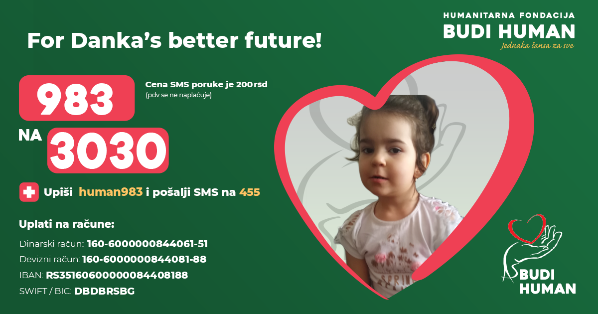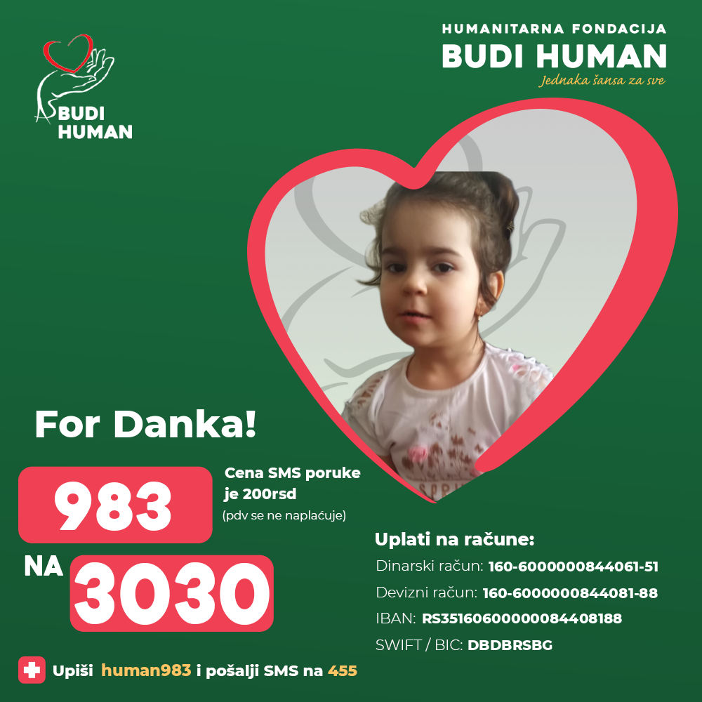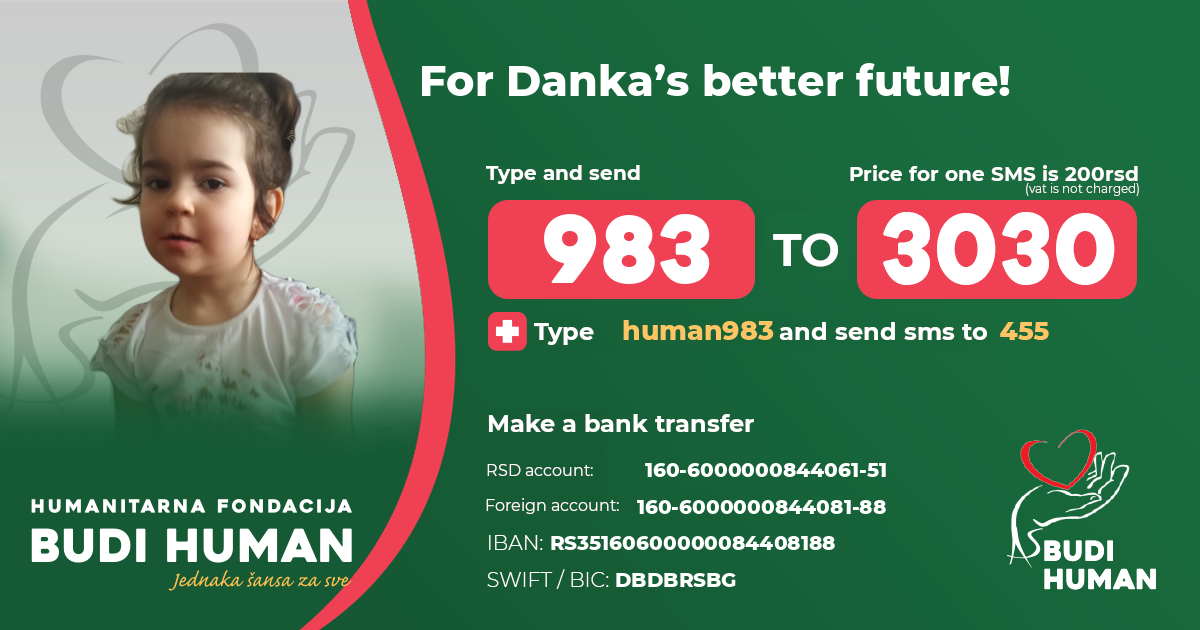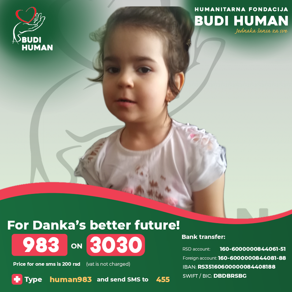 Only when Danka was two years old she was able to sit up and when she was three to stand up with the help of furniture. She is four years old now, she still doesn't speak or walk. She needs therapies to progress and get on her feet. For all that, she needs the help of all of us.