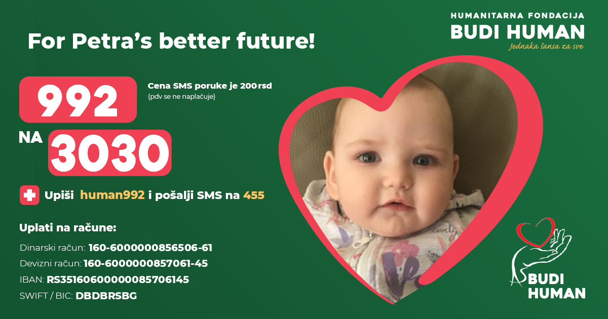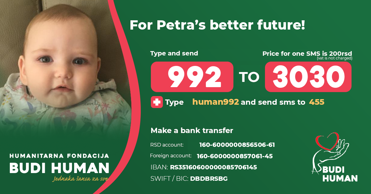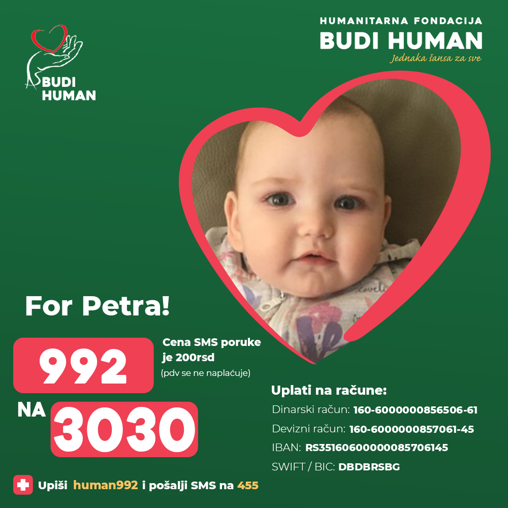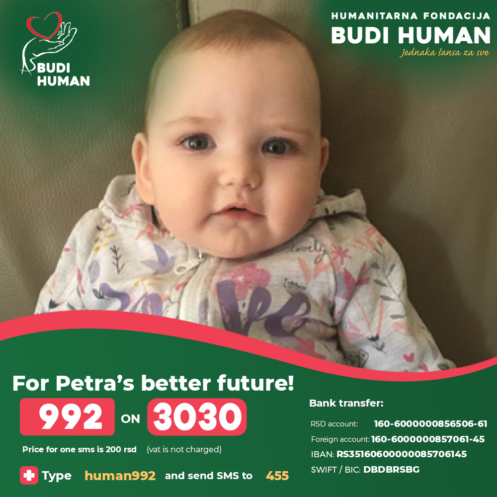 Petra was born on 15 July 2020  in Belgrade. She is the third girl in the family. Due to complications at birth, Petra got bleeding in the brain and her saturation was poor. Soon, she was diagnosed with microcephaly, hypotonia and hypertonia of the left side, hemiparesis of the left side, narrowing of the lower part of the medulla oblongata and one part of the spinal cord and polymicrogyria on the right side of the brain.
