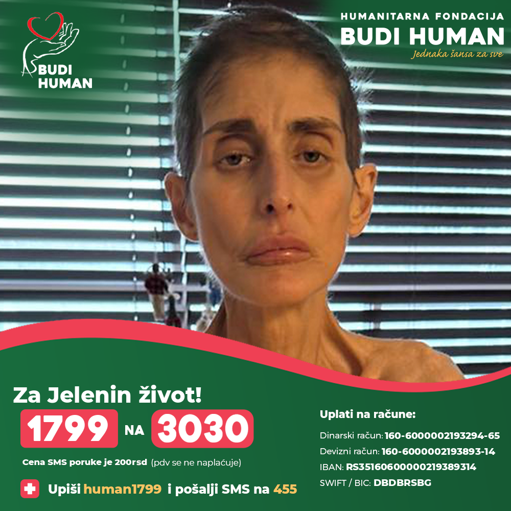 S obzirom da dijalizu veoma teško podnosi Jeleni je hitno potrebna transplantacija bubrega za koju je dobila pozitivno mišljenje od jedne bolnice u Turskoj za šta su joj neophodna značajna finansijska sredstva koja nije u mogućnosti samostalno da obezbedi pa se obraća svim ljudima dobre volje koji su u mogućnosti da pomognu da što pre prikupi neophodna sredstva.
