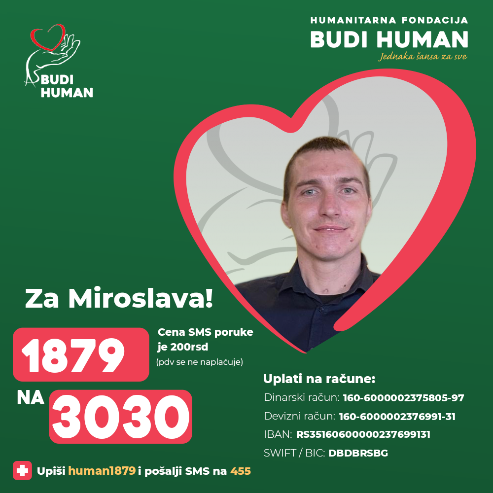 Miroslav nije u stanju da se samostalno kreće niti obavlja osnovne životne funkcije. Potrebno je što pre izvršiti operativno lečenje laktova kao i transplantaciju matičnim ćelijama na klinici u inostranstvu.
