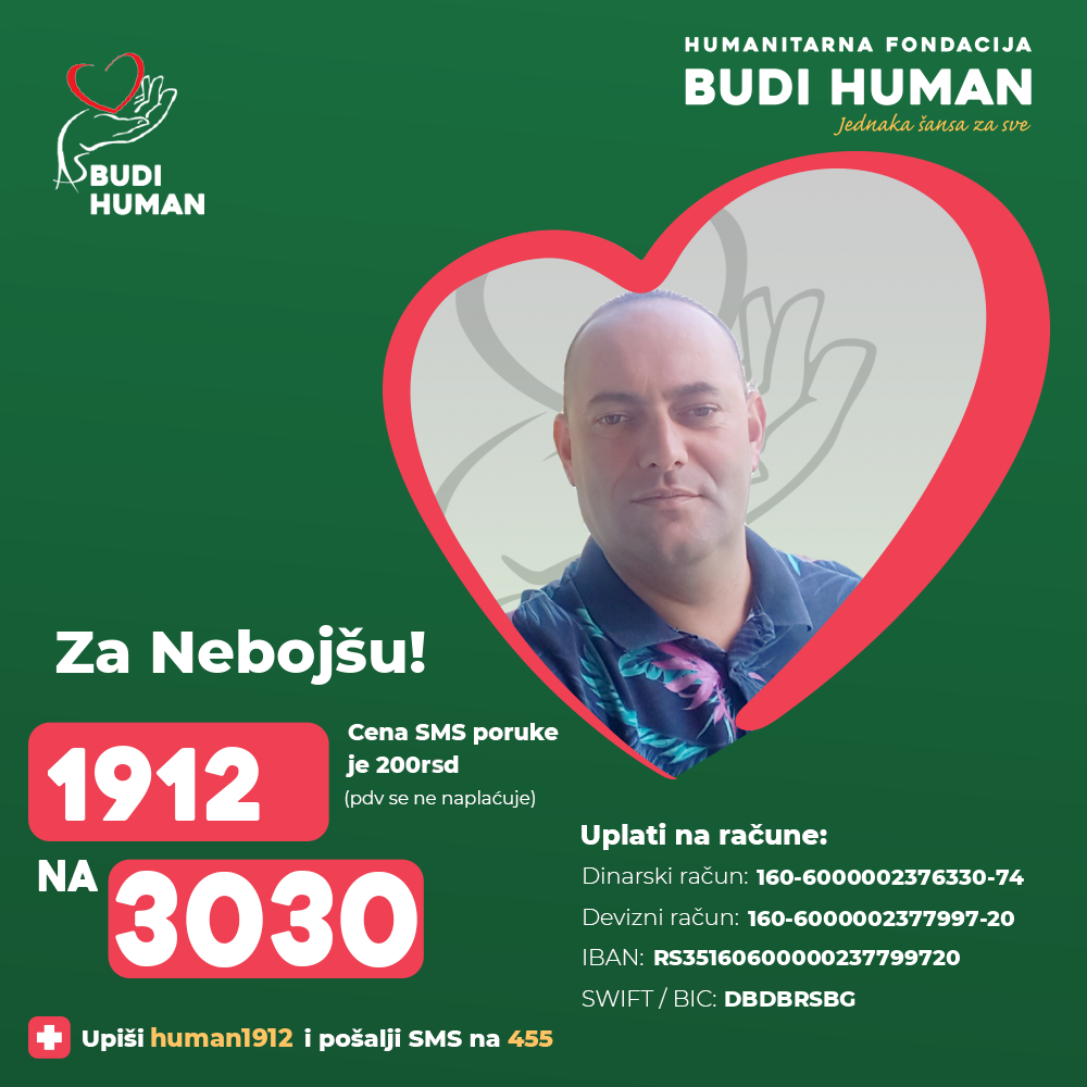 Jedinu nadu u ozdravljenje Nebojša ima u transplantaciji bubrega na klinici u Belorusiji, ali ovaj vid lečenja zahteva značajna finansijska sredstva koja porodica nije u stanju da obezbedi. Zato se mole svi ljudi dobre volje da pomognu svojim donacijama kako bi transplantacija bila obavljena u najkraćem roku.