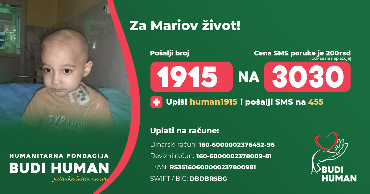 Za nastavak Mariovog lečenja u inostranstvu neophodna su značajna finansijska sredstva koja porodica nije u mogućnosti samostalno da obezbedi zbog čega je potrebna pomoć svih ljudi dobre volje u vidu donacija.