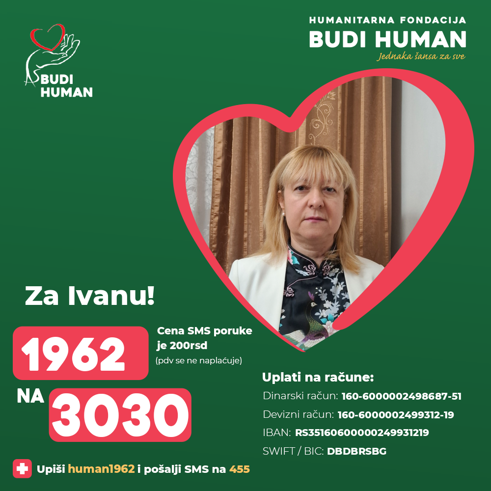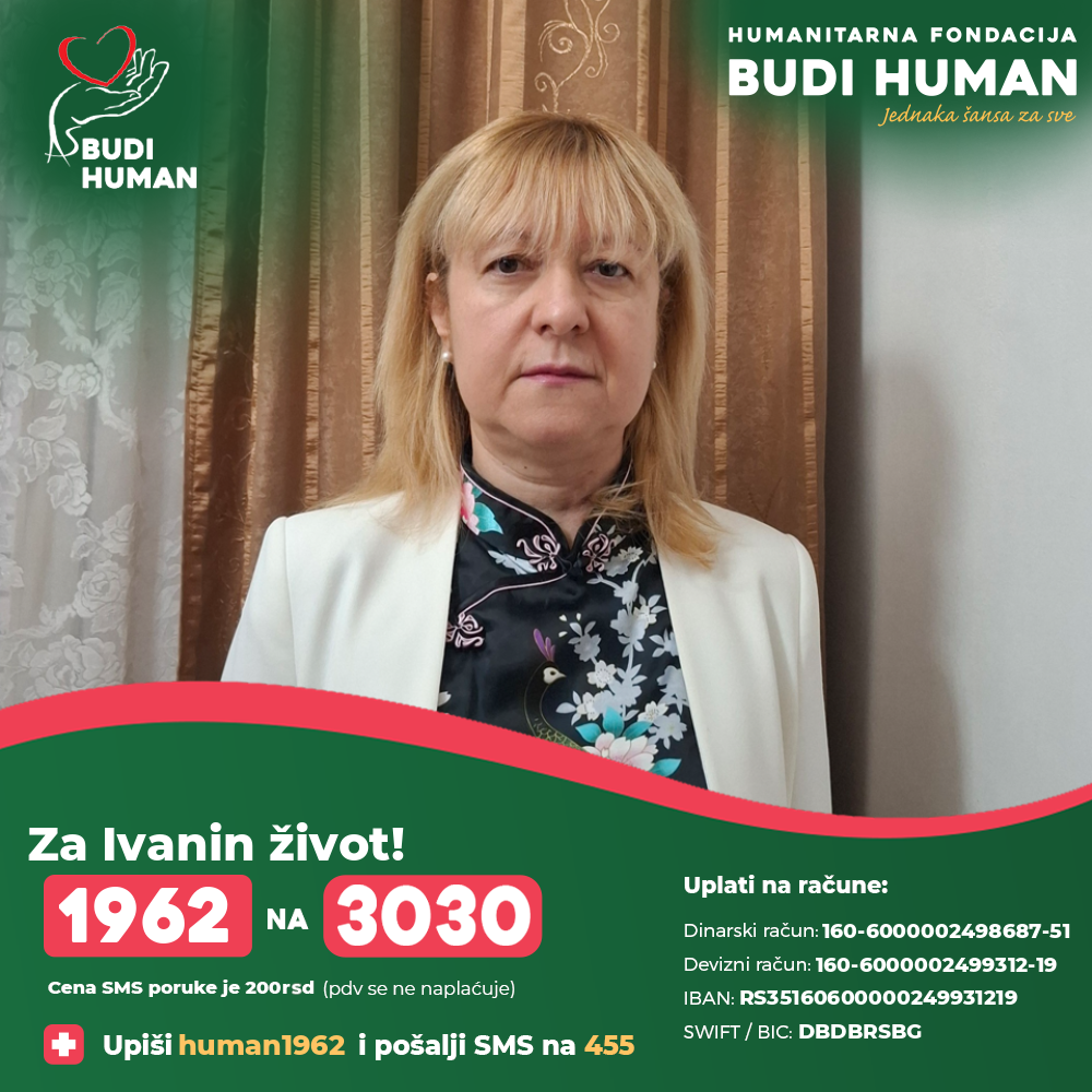 S obzirom na težinu njenog zdravstvenog stanja neophodna su značajna finansijska sredstva za nastavak lečenja. Ivana je lekar i potrebna joj je pomoć svih humanih ljudi u vidu donacija kako bi ozdravila i nastavila da se bavi svojim humanim pozivom.