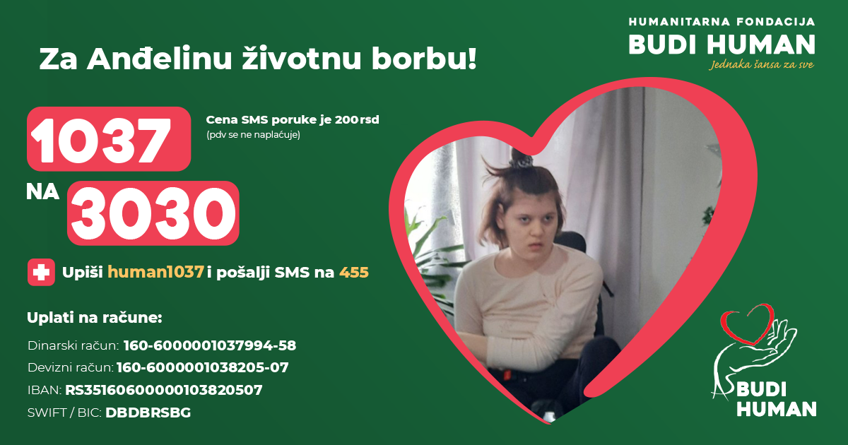Анђела је рођена 26.06.2011. године, из одржаване трудноће. Све се чинило у реду до тренутка када је мајка приметила сметње у развоју. Кренули су епилептични напади и клиничка испитивања која су трајала годинама, јер је у питању ретка болест изазвана мутацијом гена. Дијагностиковане су јој три дијагнозе, Dg.G40.5 Рана инфантилна еппилептичка енцефалопатија CDKL5, Dg.F72.0 Тешка душевна заосталост (нема поремећаја понашања или су минимални) и Dg.G80.0 Paralysis cerebralis spastica quadriplegica (парализа).