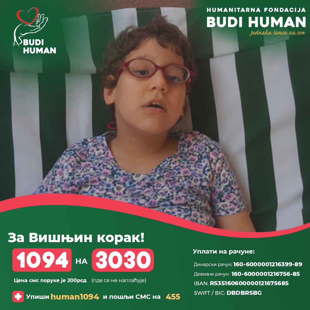 Да би напредовала у лечењу и стала на своје ноге, потребан је интензиван рад. Вишњини родитељи су сво лечење до сад, финансирали сами и исцрпели све ресурсе, стога се обраћају свим хуманим људима да им својим донацијама помогну.