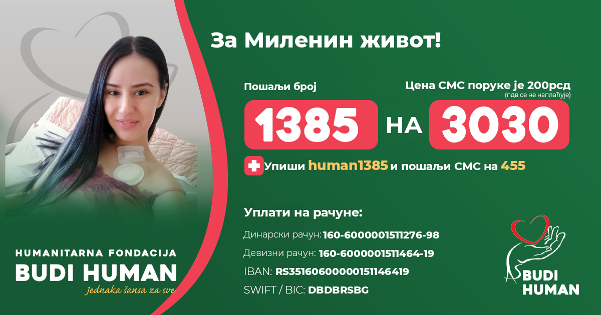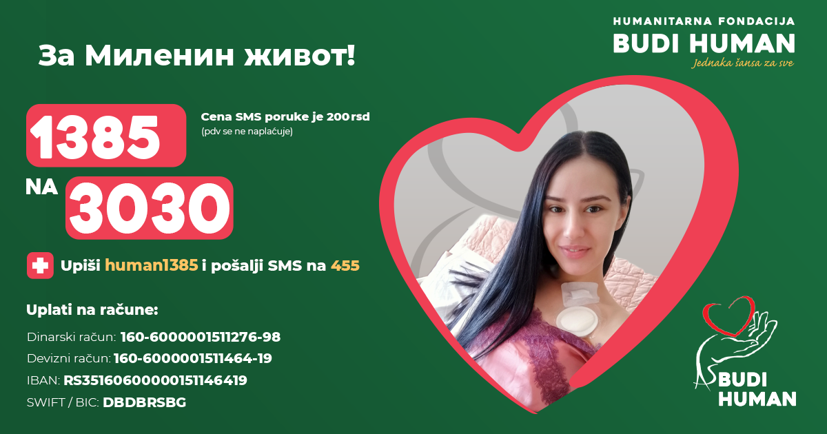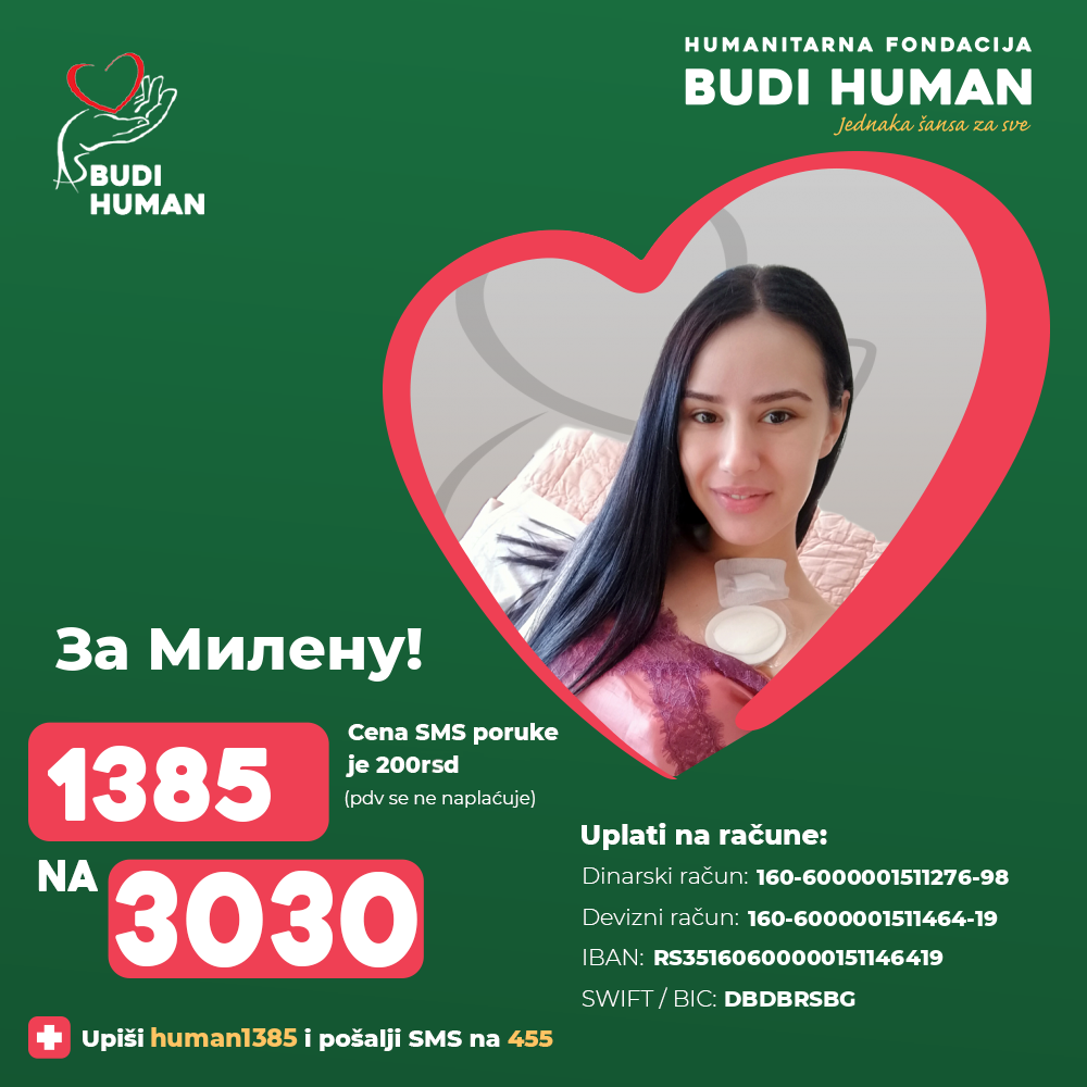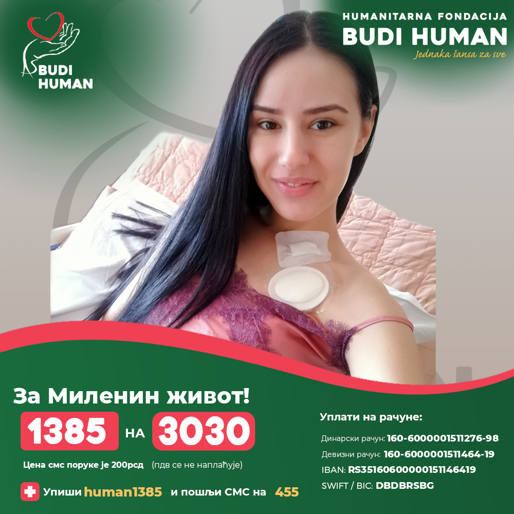 Будући да у породици нема одговарајућег донора као и да у Србији нема могућност добијања лека па ни саме трансплантације, иако је на листи чекања већ неколико година Милена је одлучила да шансу за нови живот потражи на једној клиници у иностранству.