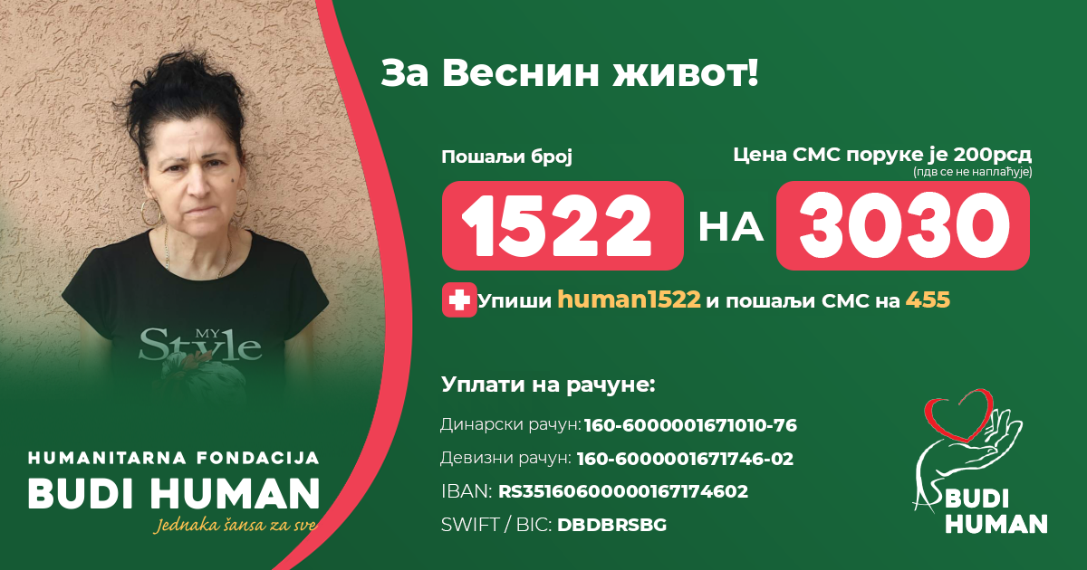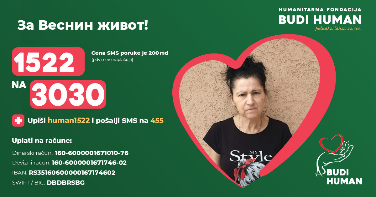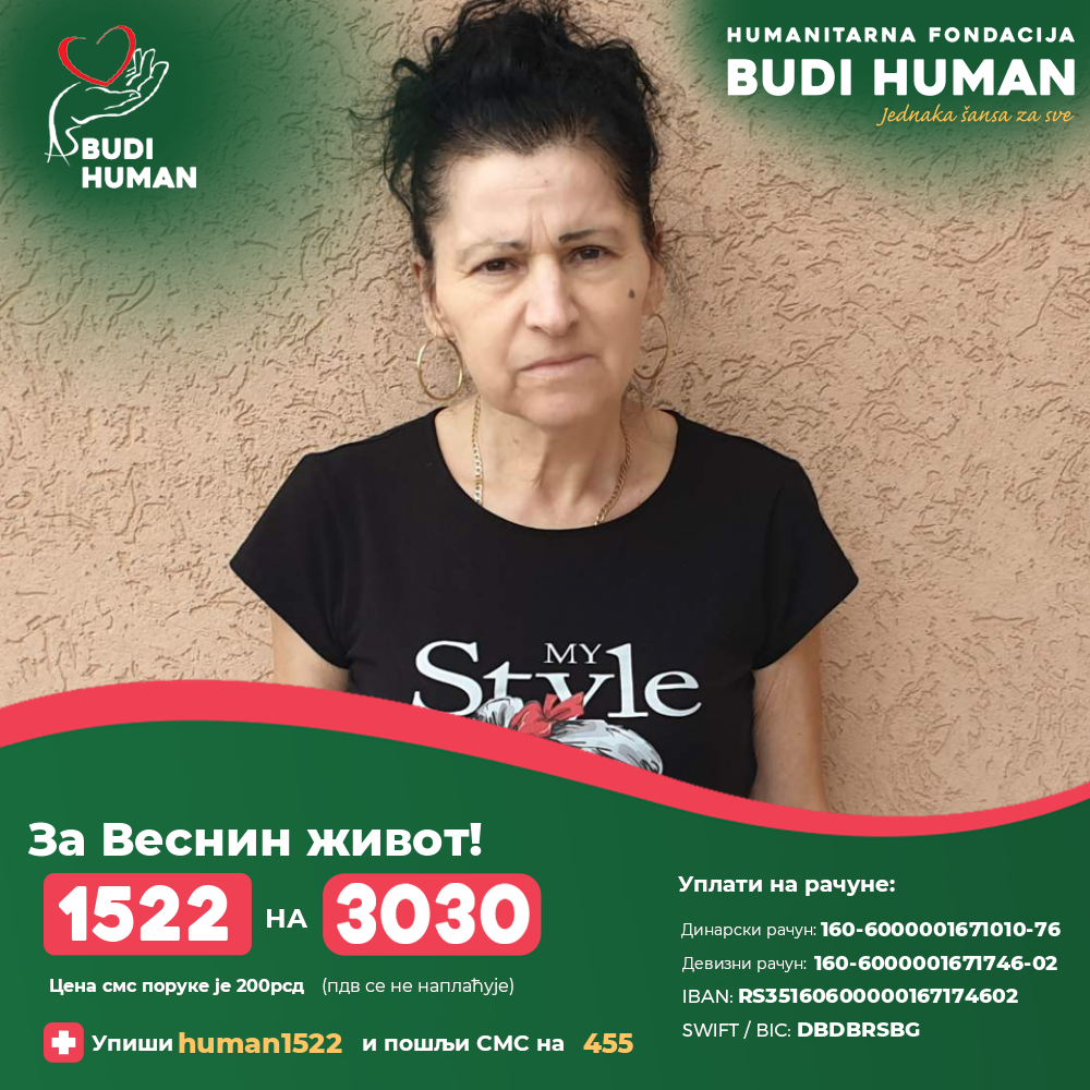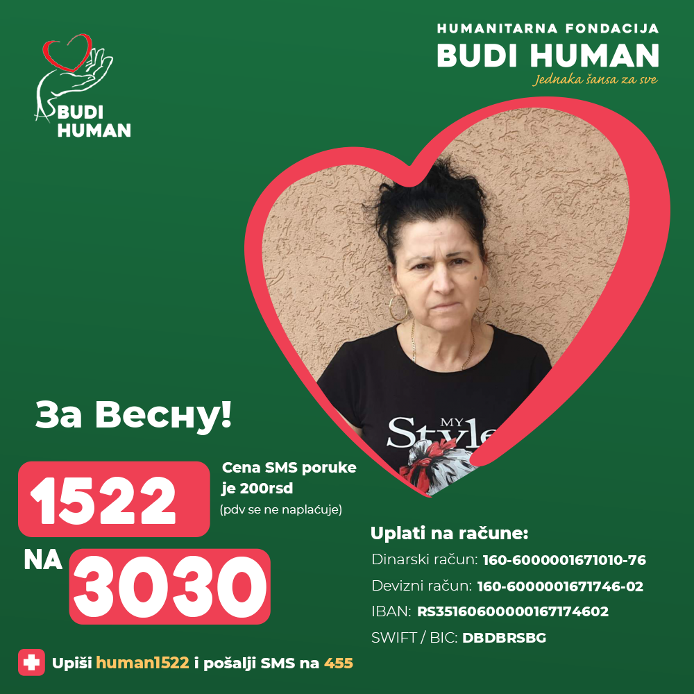 Како трошкови лечења превазилазе могућности породице, обраћају се свим људима добре воље да помогну да Весна што пре добије адекватну терапију да би зауставили прогресију болести.